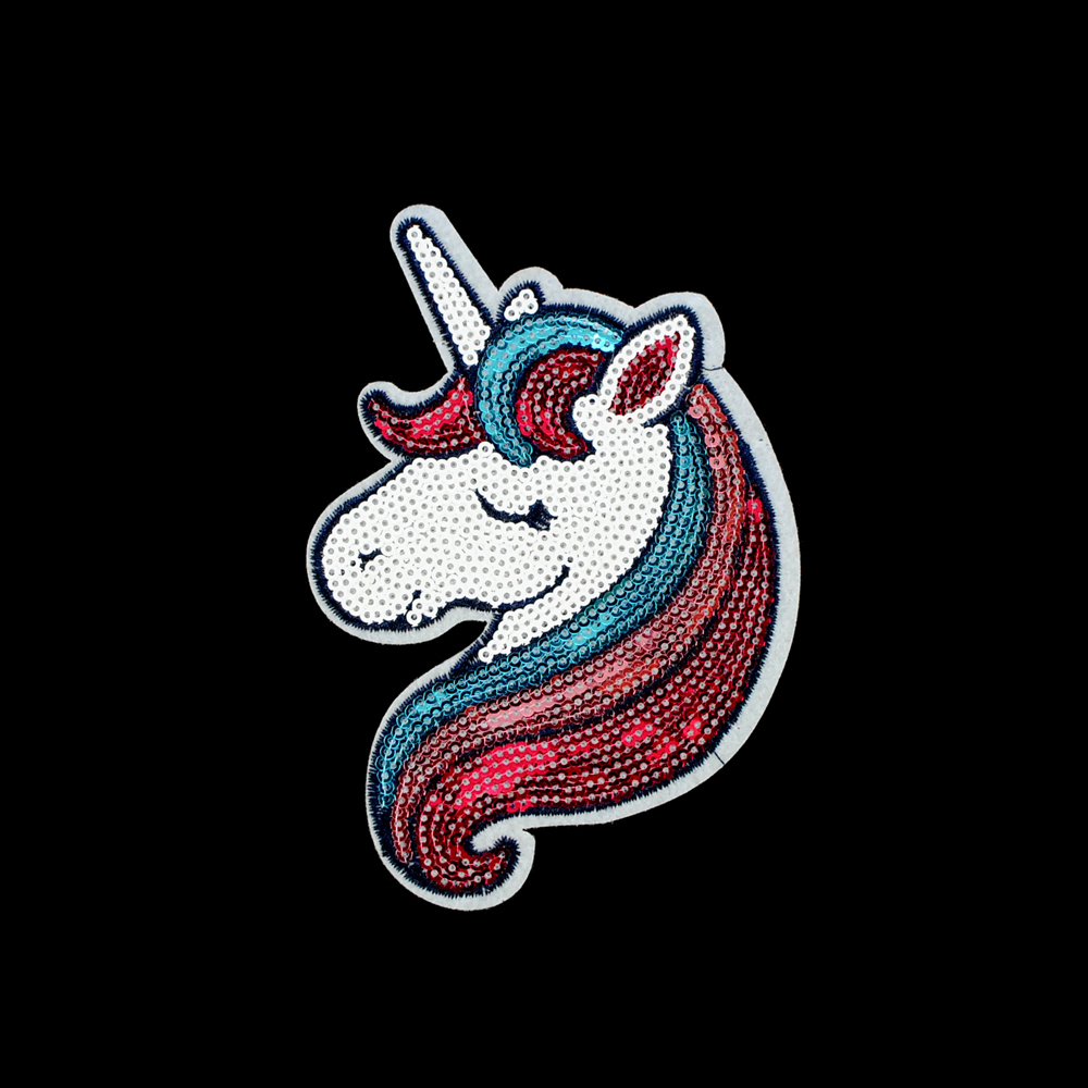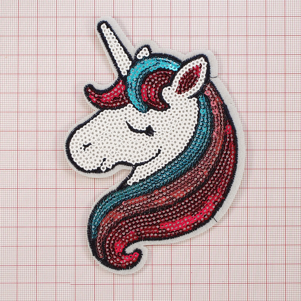 Аппликация клеевая пайетки Единорог голова 13*9см, черный, белый, голубой, розовый, шт