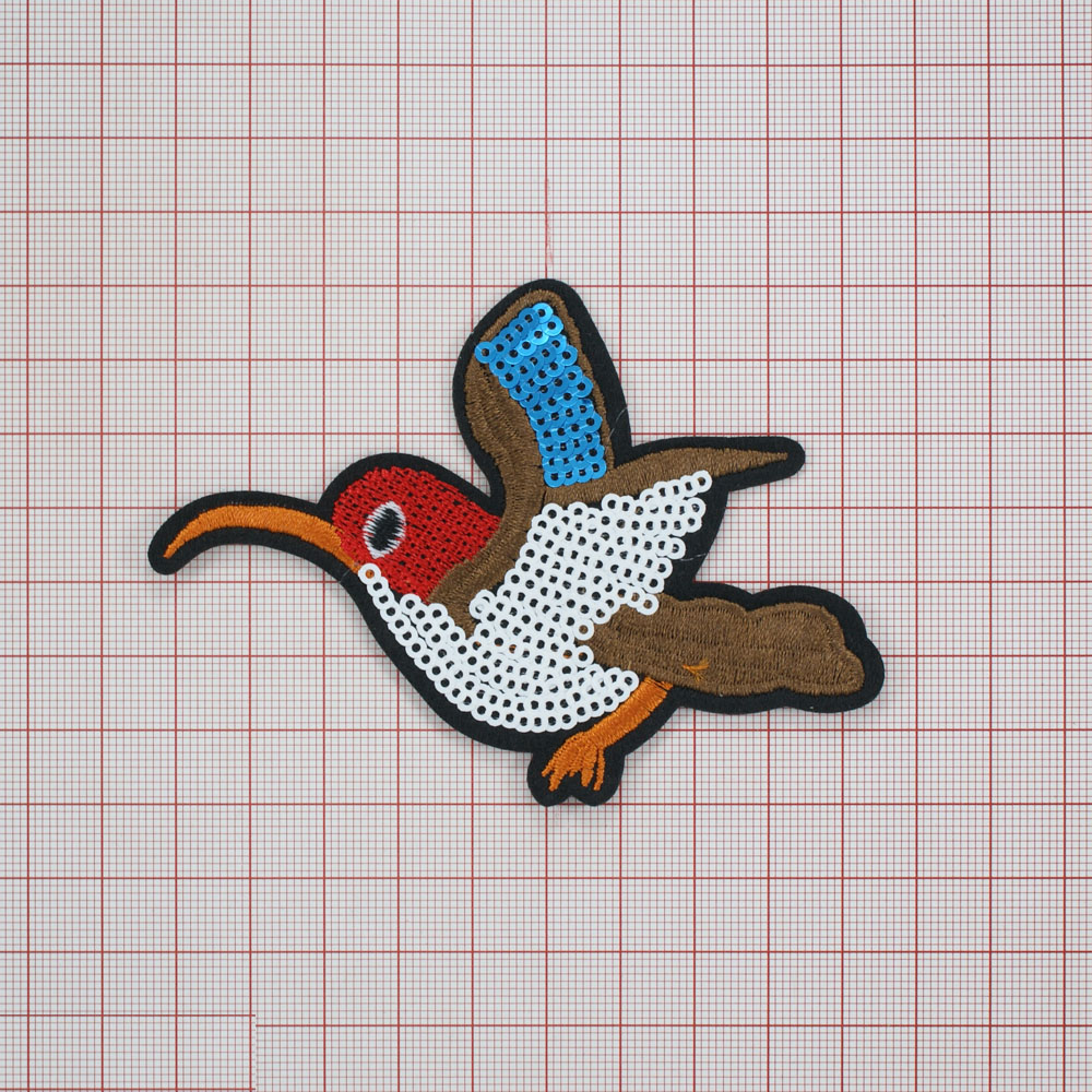 Аппликация клеевая пайетки Колибри 10*7см черный, коричневый, оранжевый, красный, белые и синие пайетки, шт