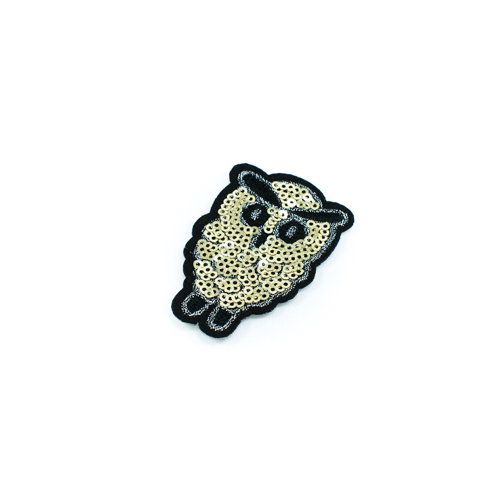Аппликация клеевая пайетки Сова 6,4*4,4см черные, белые нити, золотистые пайетки