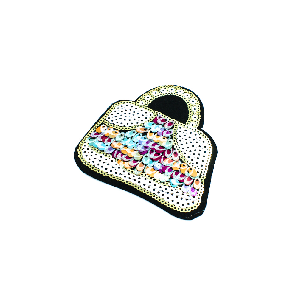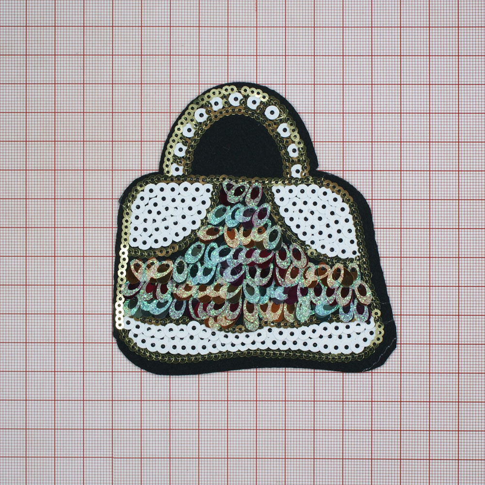 Аппликация клеевая пайетки Сумочка 10*10 см черная основа, белые, цветные, золотые пайетки