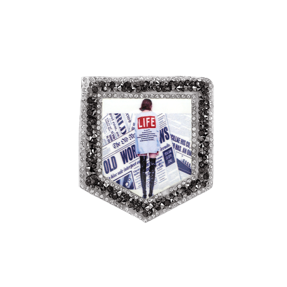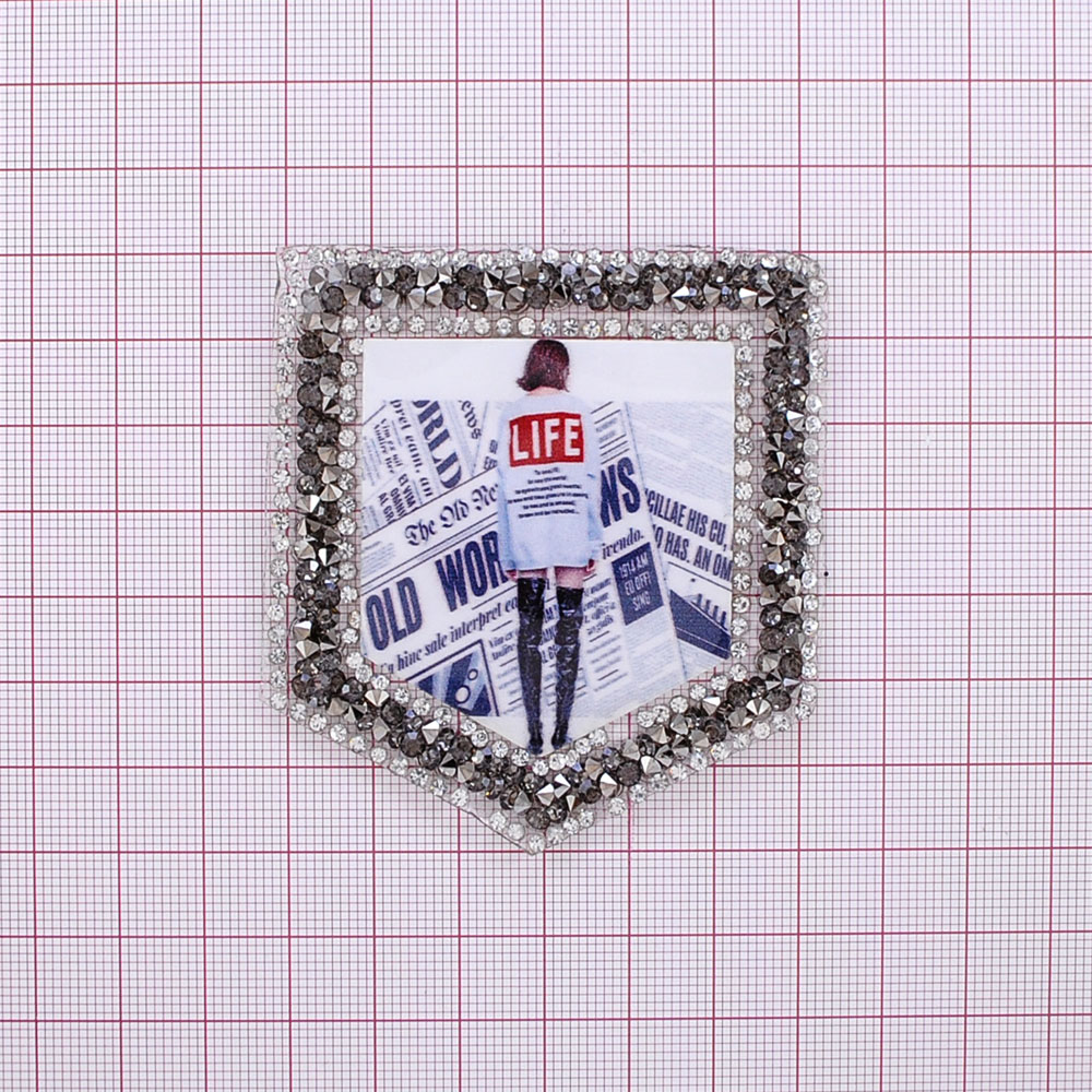 Аппликация карман клеевая тканевая со стразами Девушка и газеты, 6,5*7см, белый, black diamond, красный, черный, шт