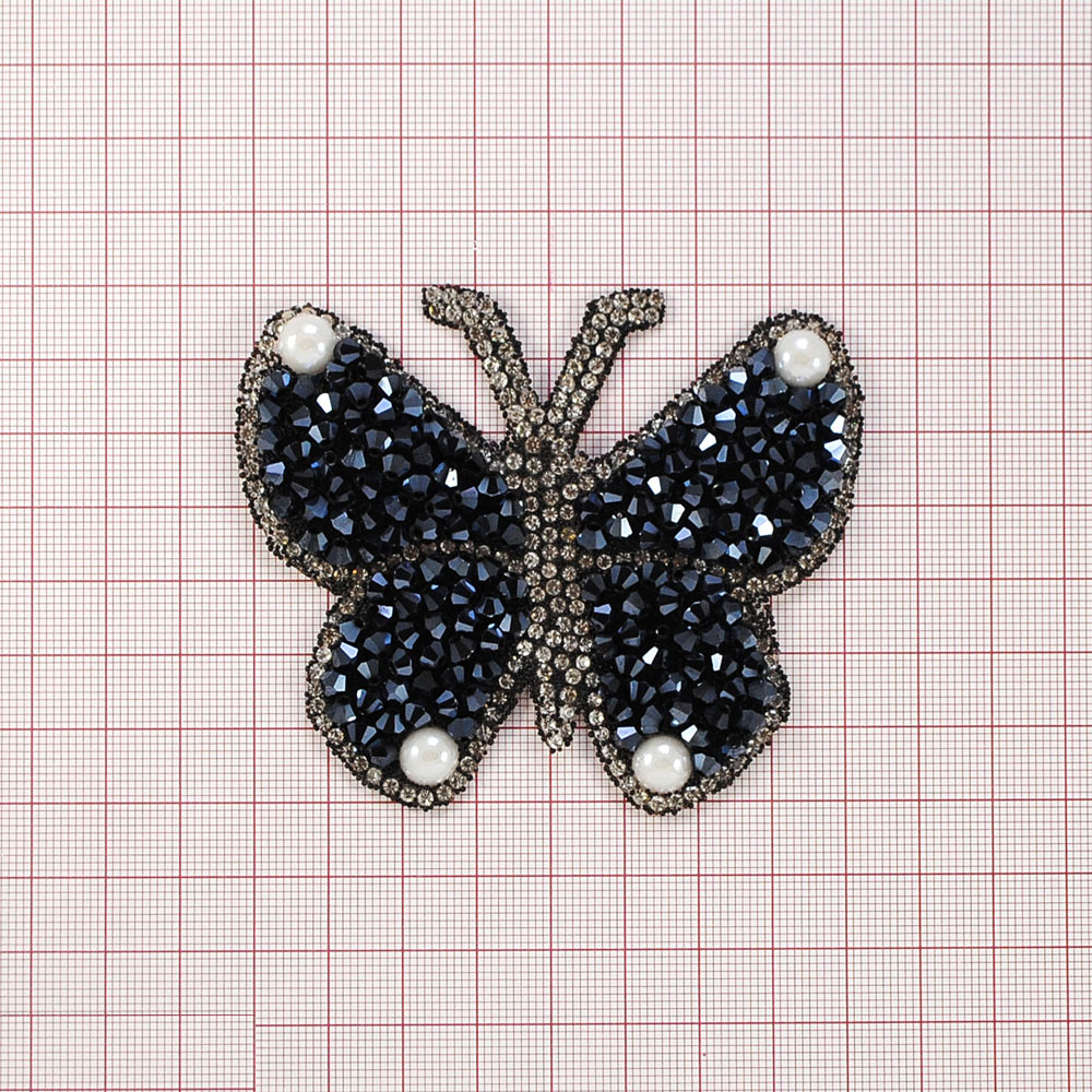 Аппликация клеевая стразы Бабочка 7*9см, синий, белый, белый жемчуг, шт