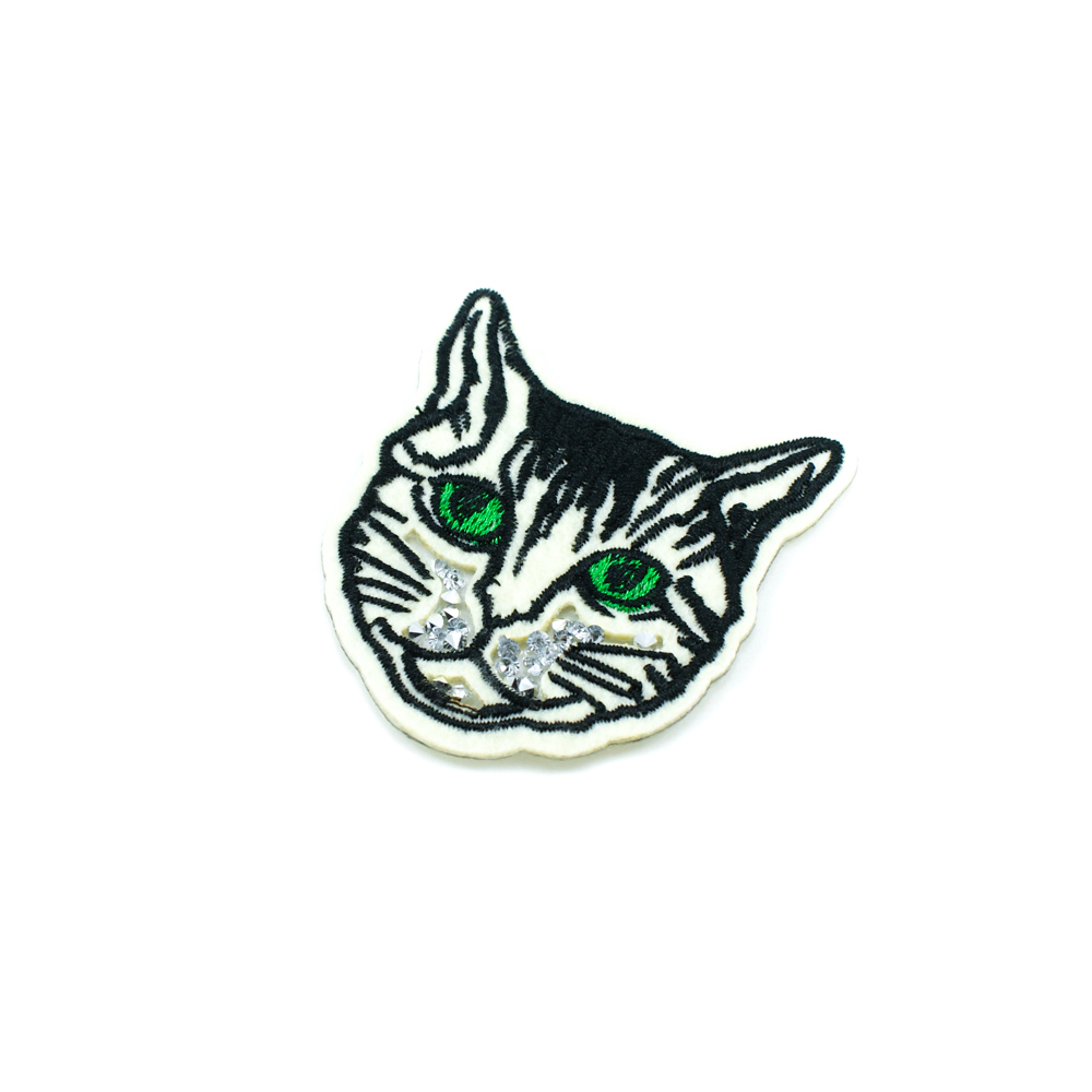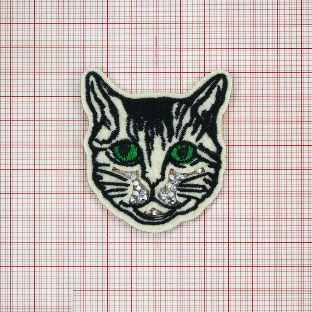 Аппликация клеевая стразы Чеширский кот 6,7*6,5см белый, черный, зеленый, камни белый, шт.