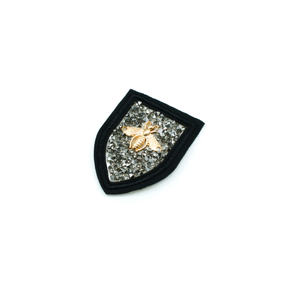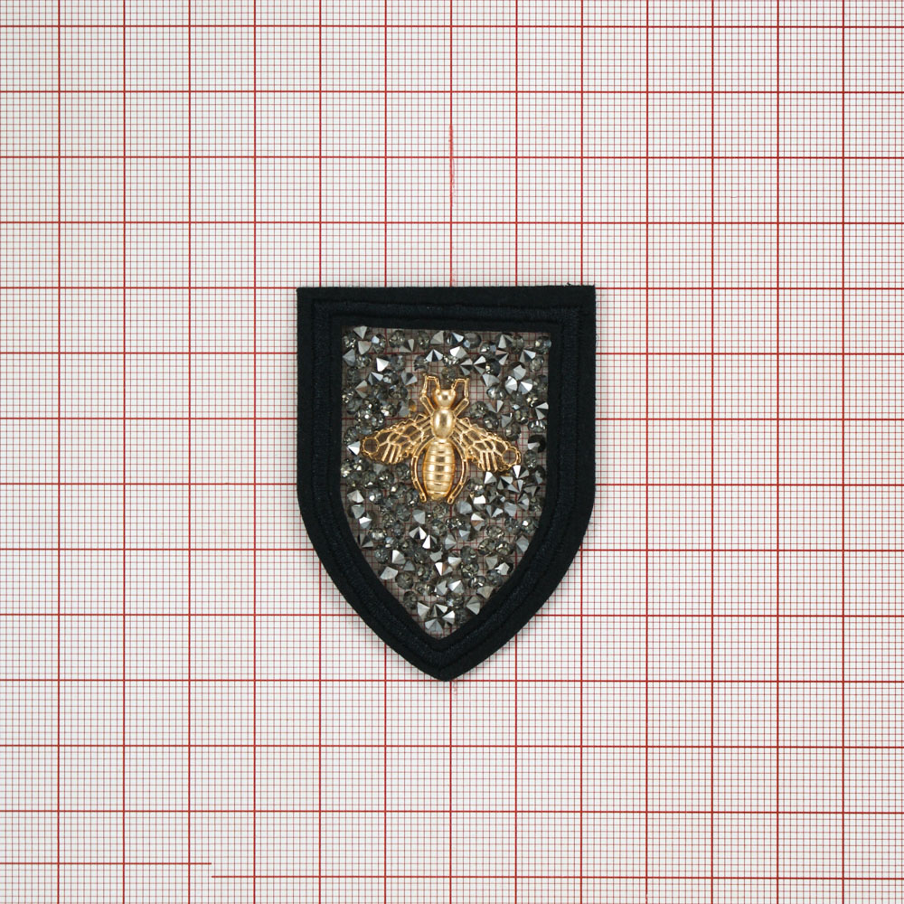 Аппликация клеевая стразы Эмблема пчела 6*4,5см черный, камни дымчатый белый, металл золото, шт.