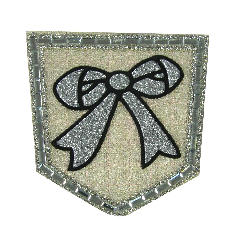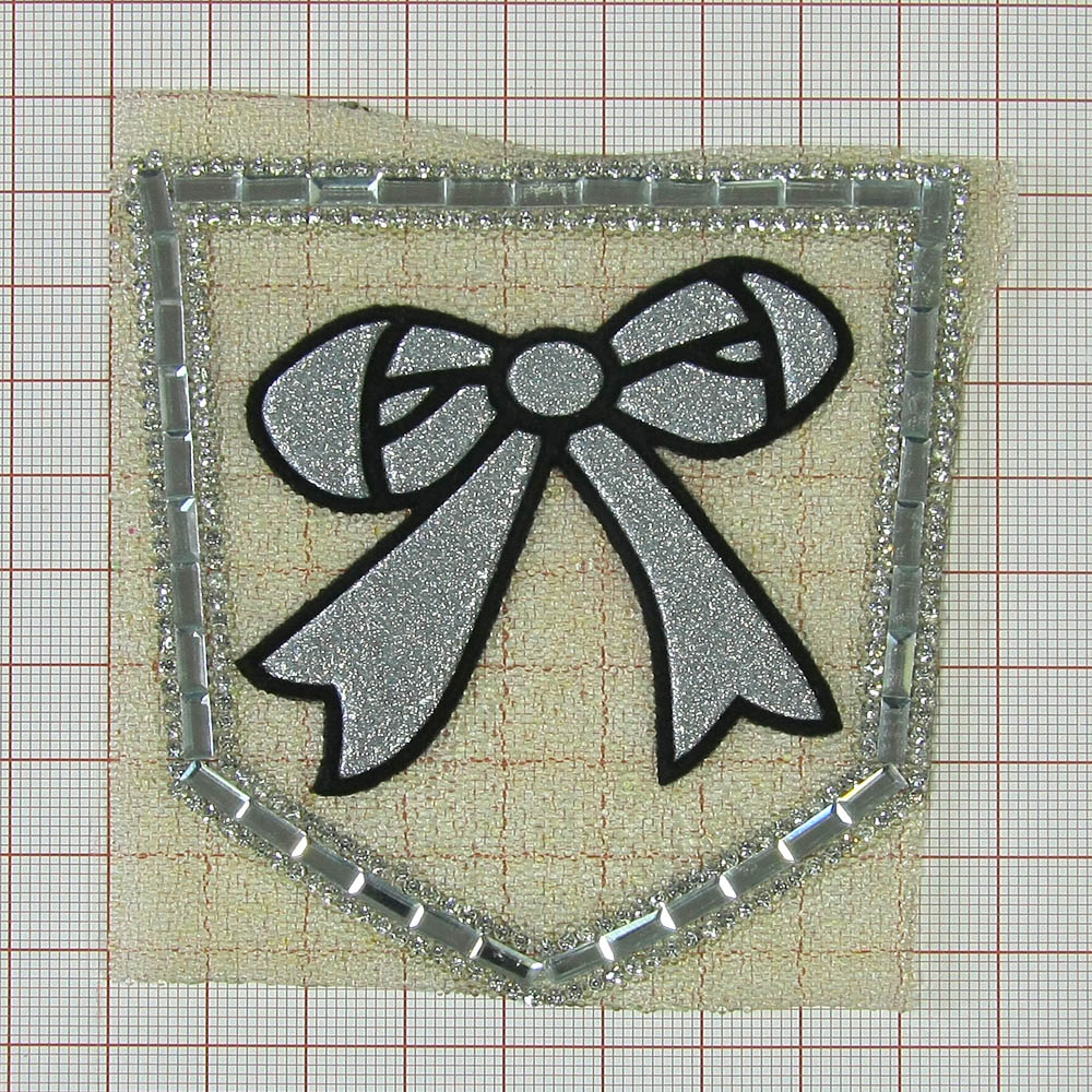 Аппликация клеевая стразы карман Бантик светло-желтый хамелеон, серебро, черный замш, белые камни, 9*9см, шт