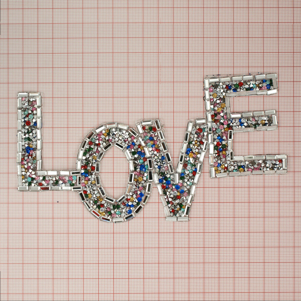Аппликация клеевая стразы LOVE цветные буквы 18,5*9,2см цветные камни, белые прямоугольные камни кант, фигурная