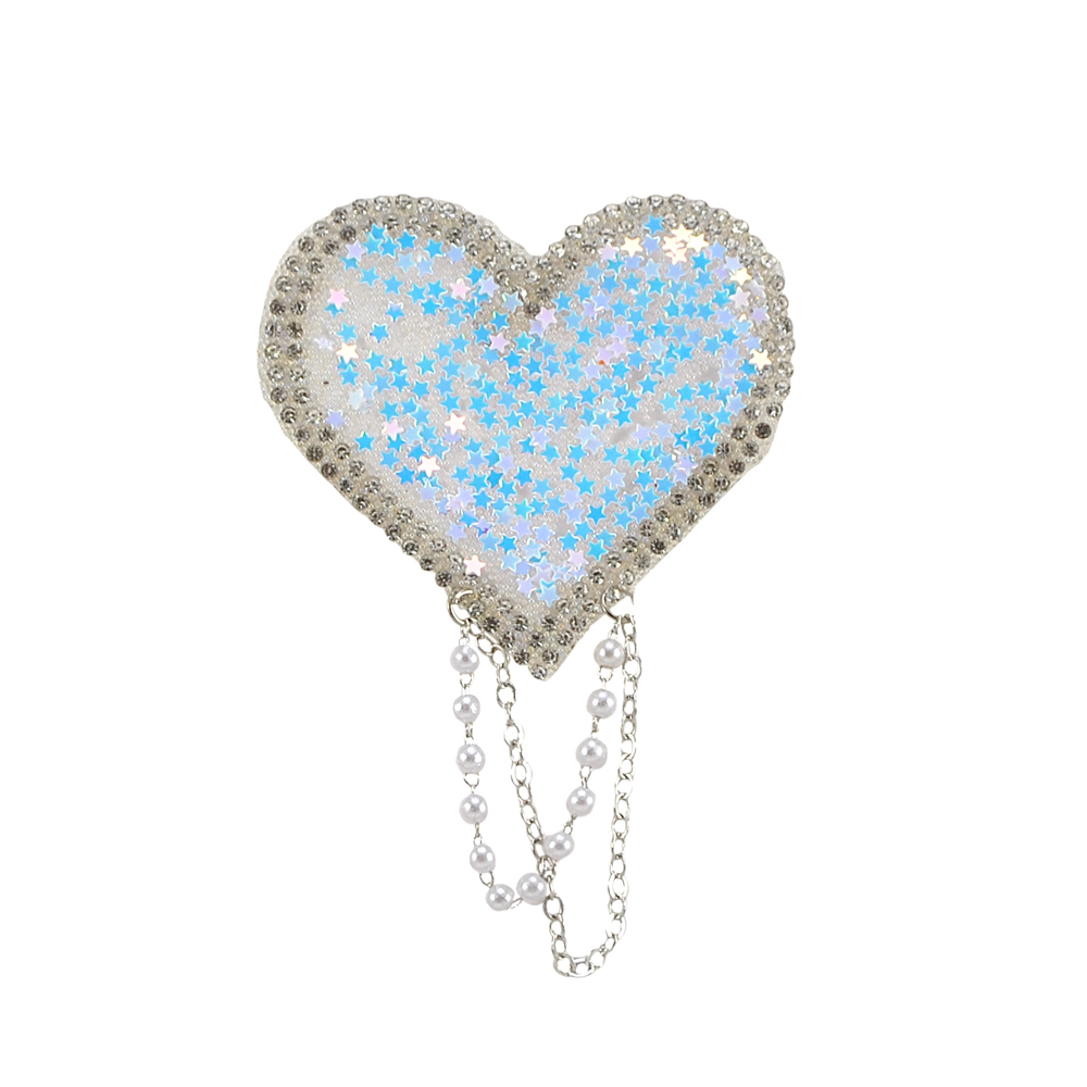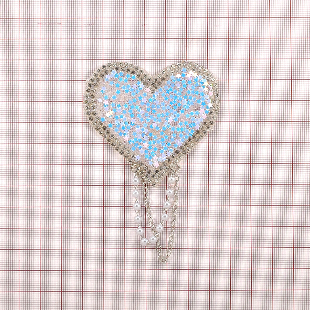 Аппликация клеевая стразы с подвесками Сердце, 6,5*9,5см, голубой, розовый, белые камни, жемчуг, цепь, пайетки, шт.