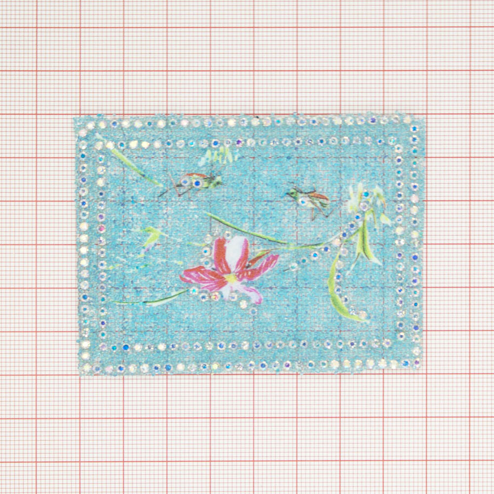Аппликация клеевая стразы, стеклянная крошка Кузнечики и цветок 6*8см голубой бисер, хамелеон камни, шт