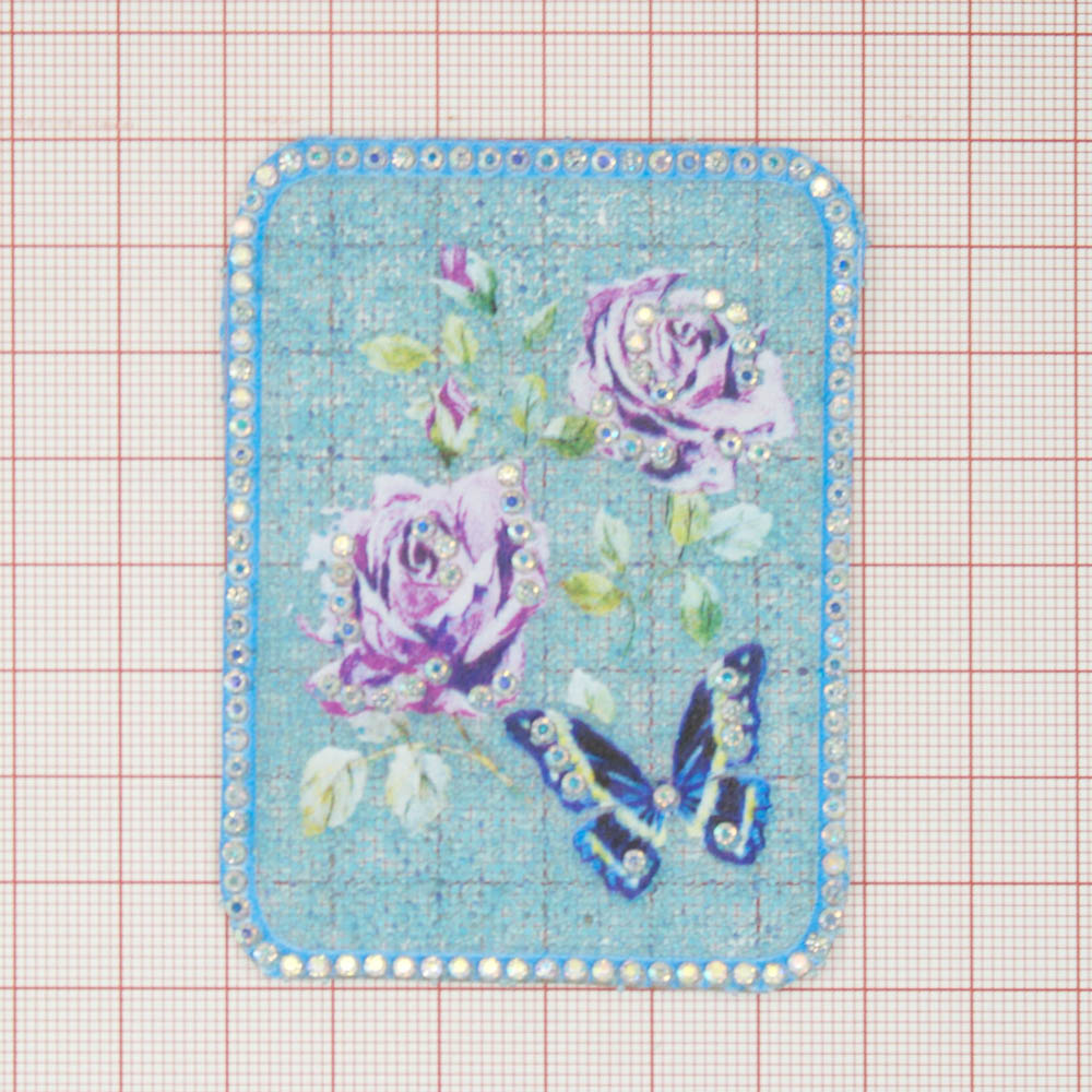 Аппликация клеевая стразы, стеклянная крошка, Розы Сиреневые, синяя Бабочка, 6*8см, голубой бисер, хамелеон камни, голубой кант, шт