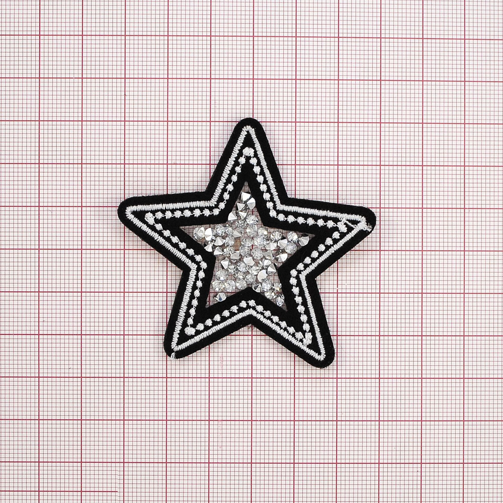 Аппликация клеевая стразы Звезда 6*6см белый и черный, камни белые, шт