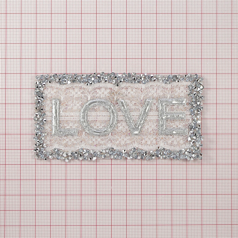 Аппликация карман клеевая тканевая, гречка, кружево LOVE, 10*6см, белый, серебро, шт