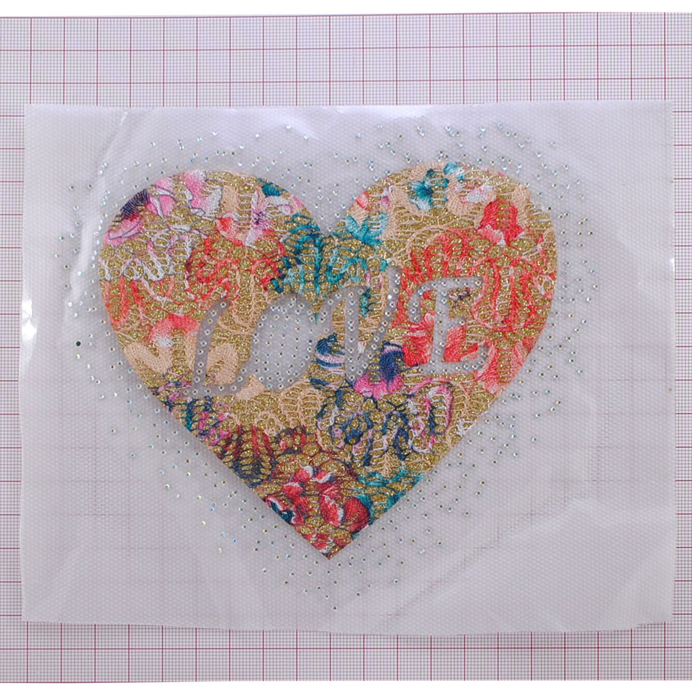 Термоаппликация тканевая принт Сердце Love со стразами, 16*15см, белый, бежевый, голубой, розовый, шт