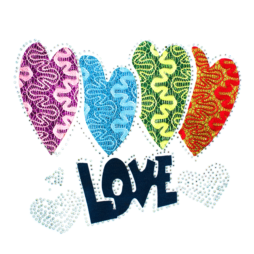 Термоаппликация тканевая со стразами 4 Сердца LOVE 23*20см розовый, голубой, зеленый, красный, синий, шт