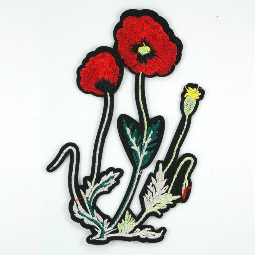 Аппликация клеевая вышитая 2 мака 14*9,5см, красный, грязно-зеленый, черный, белый, желтый