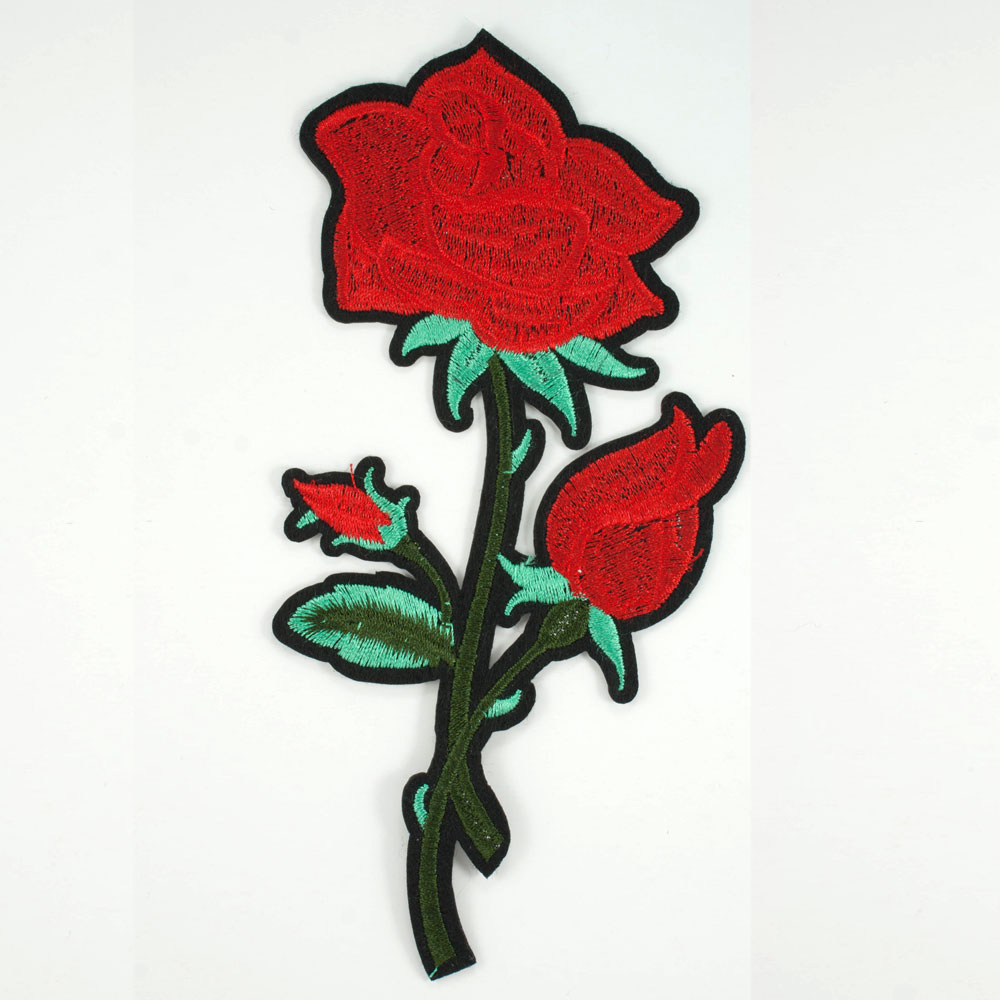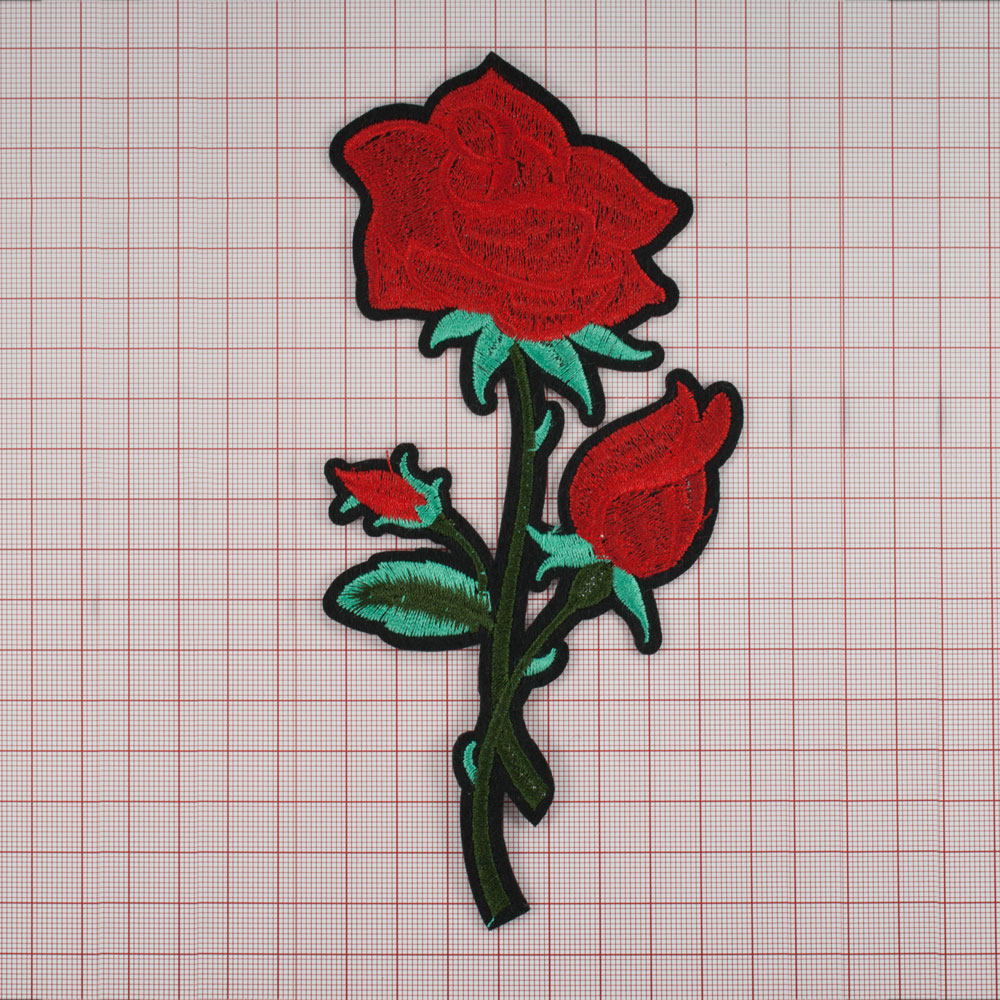 Аппликация клеевая вышитая 3 розы на стебле 17*9см, красный, зеленый, черный, салатовый