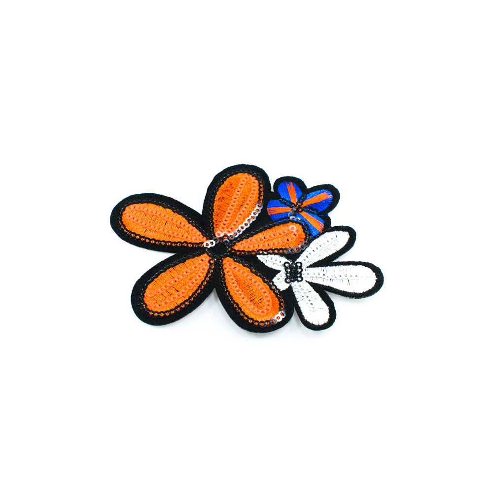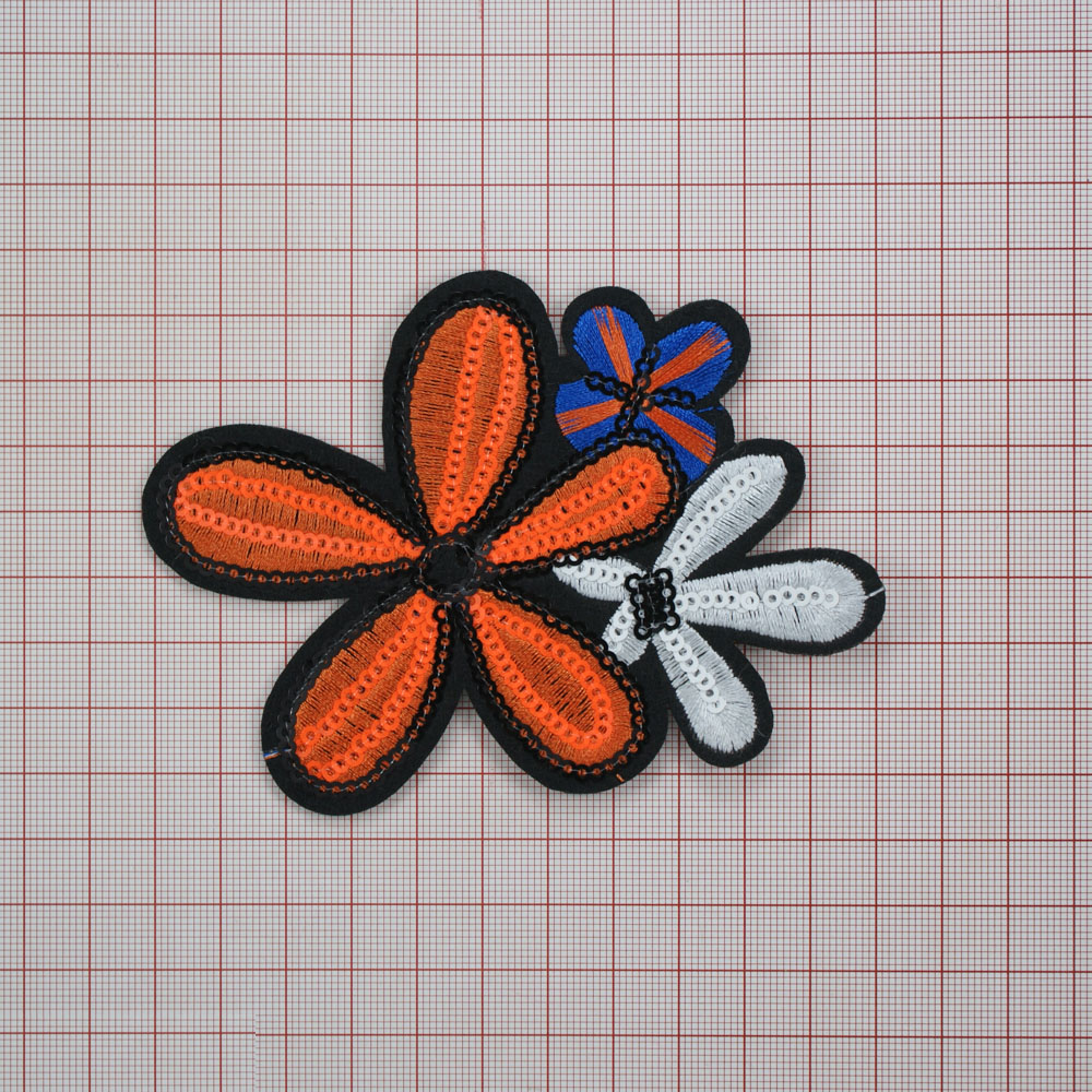 Аппликация клеевая вышитая 3 Цветка 11,3*8см оранжевый, синие, серебристые нити, черные, оранжевые, серебрянные пайетки