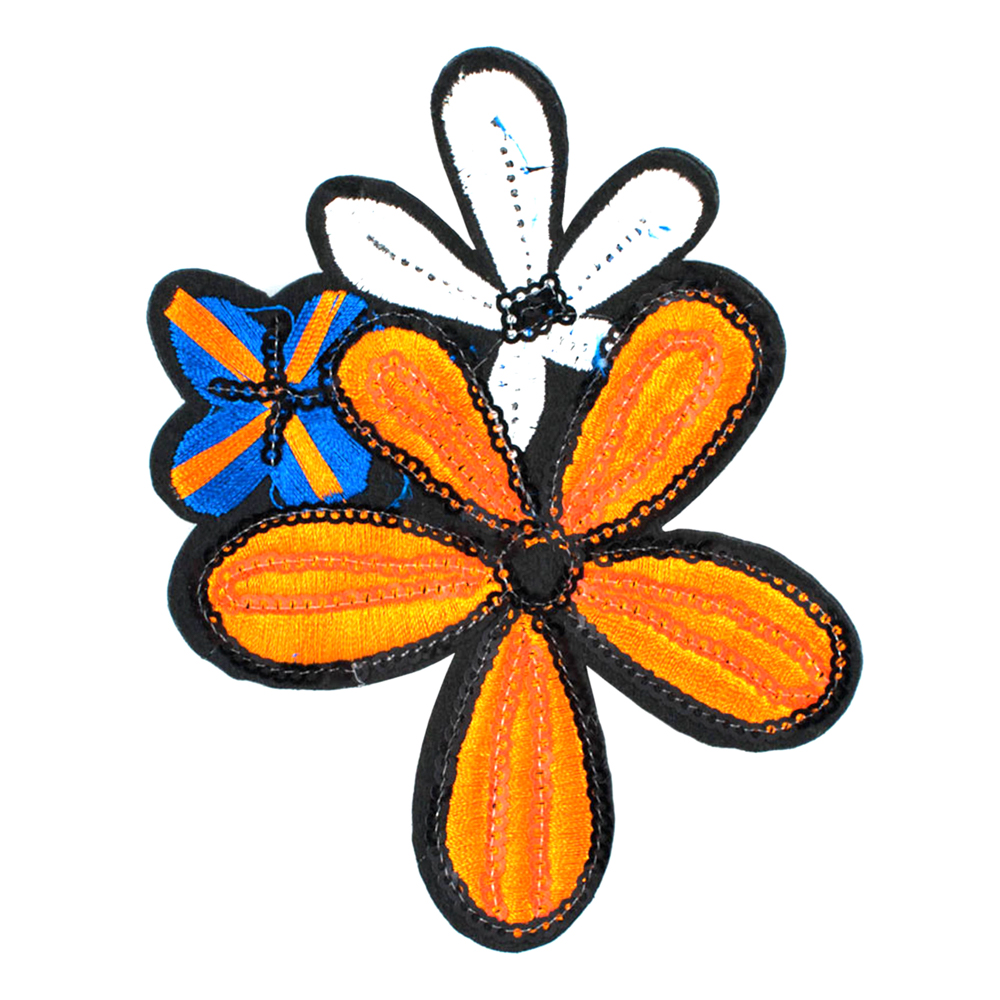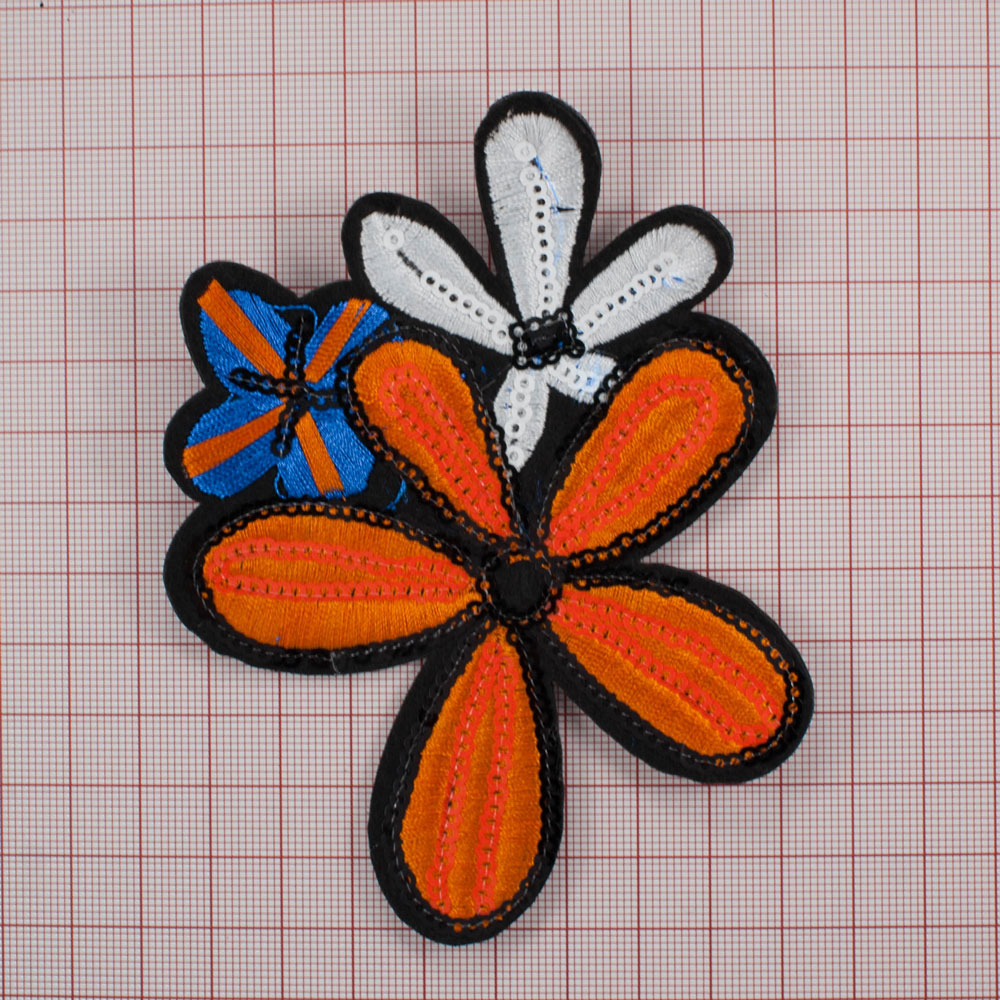 Аппликация клеевая вышитая 3 цветка 12*9,5см, оранжевый, синий, белый
