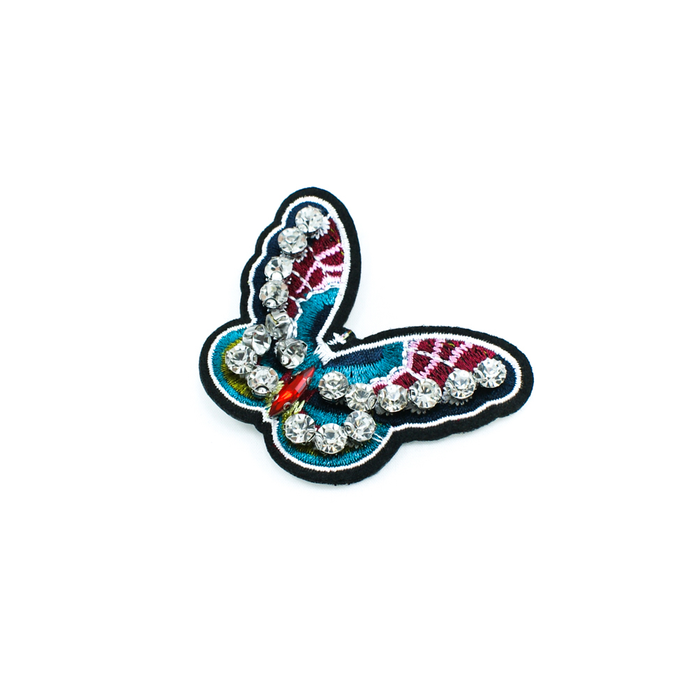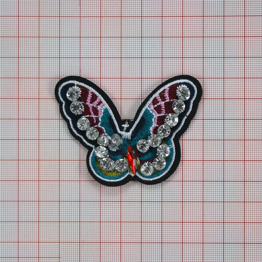 Аппликация клеевая вышитая Бабочка со стразами 8*7см черный, зеленый, голубой, розовый, бордовый, белый и белые камни, шт