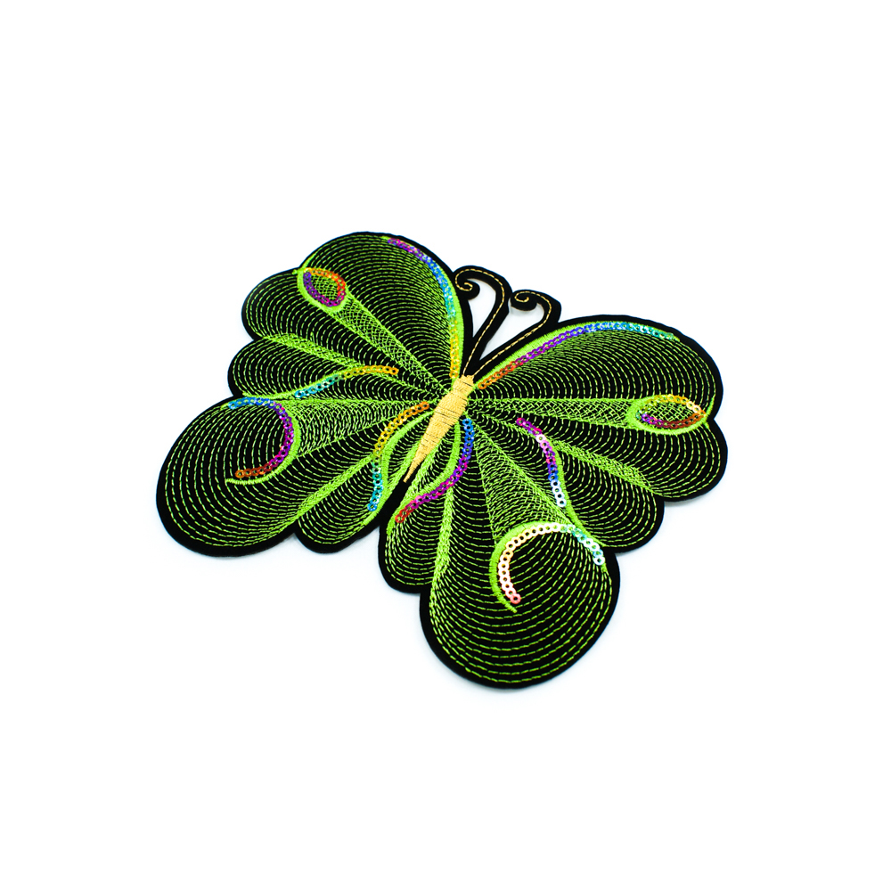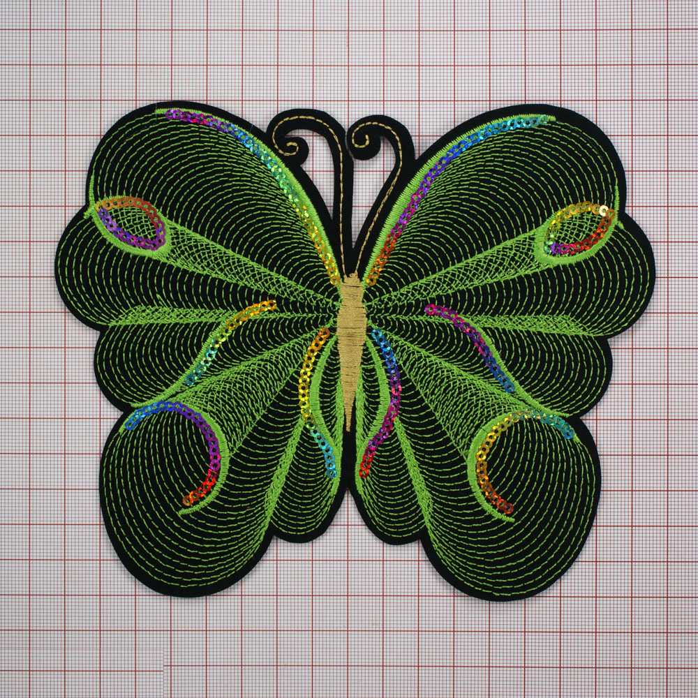 Аппликация клеевая вышитая Бабочка Строчка 17*14см зеленые, желтые нити, хамелеон пайетки