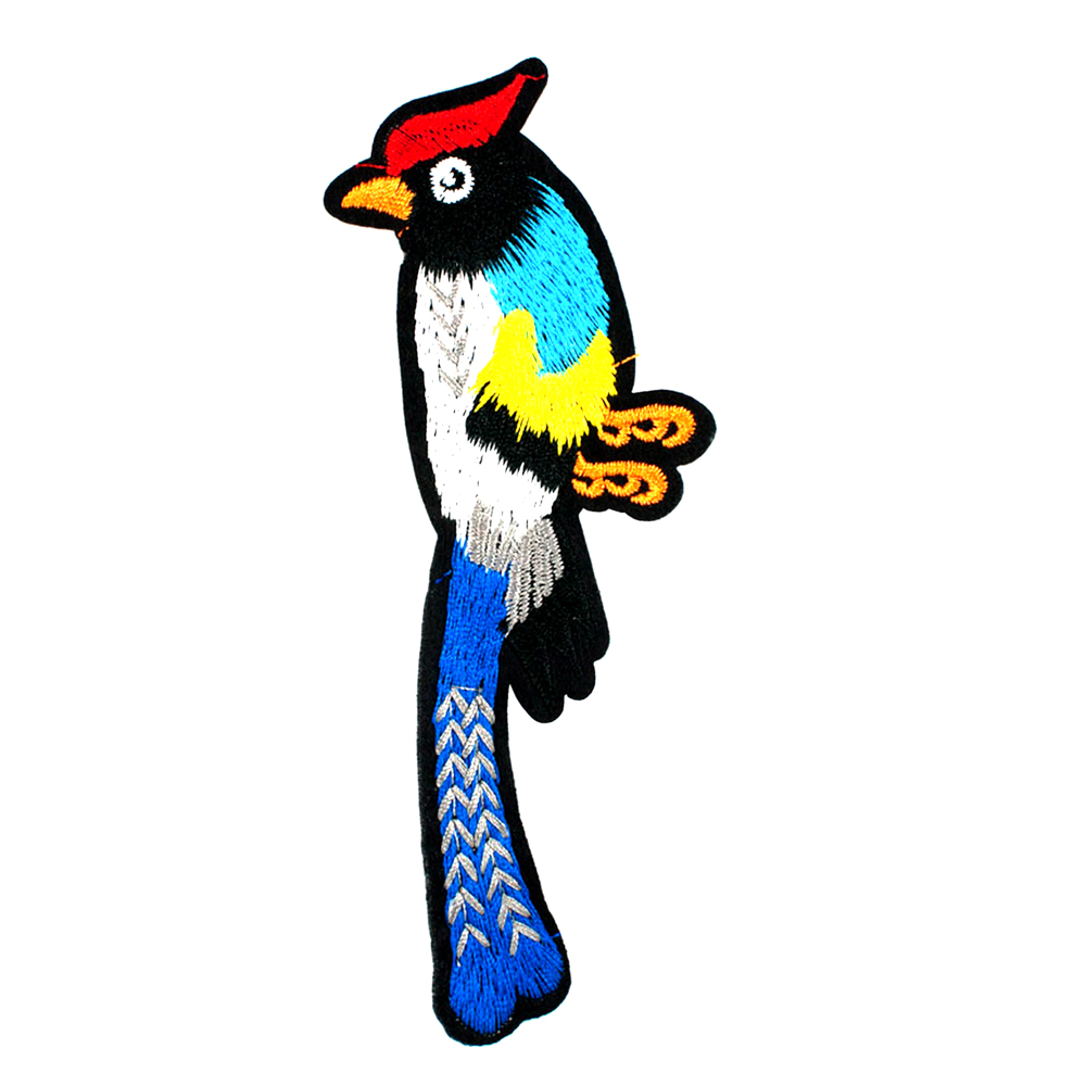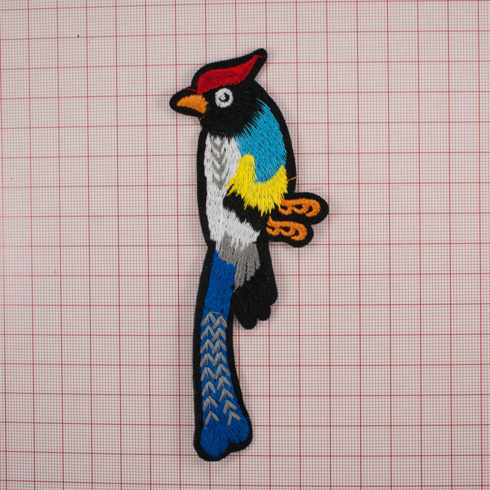 Аппликация клеевая вышитая Дятел 13,5*5,5см, красный, голубой, желтый, белый, синий хвост