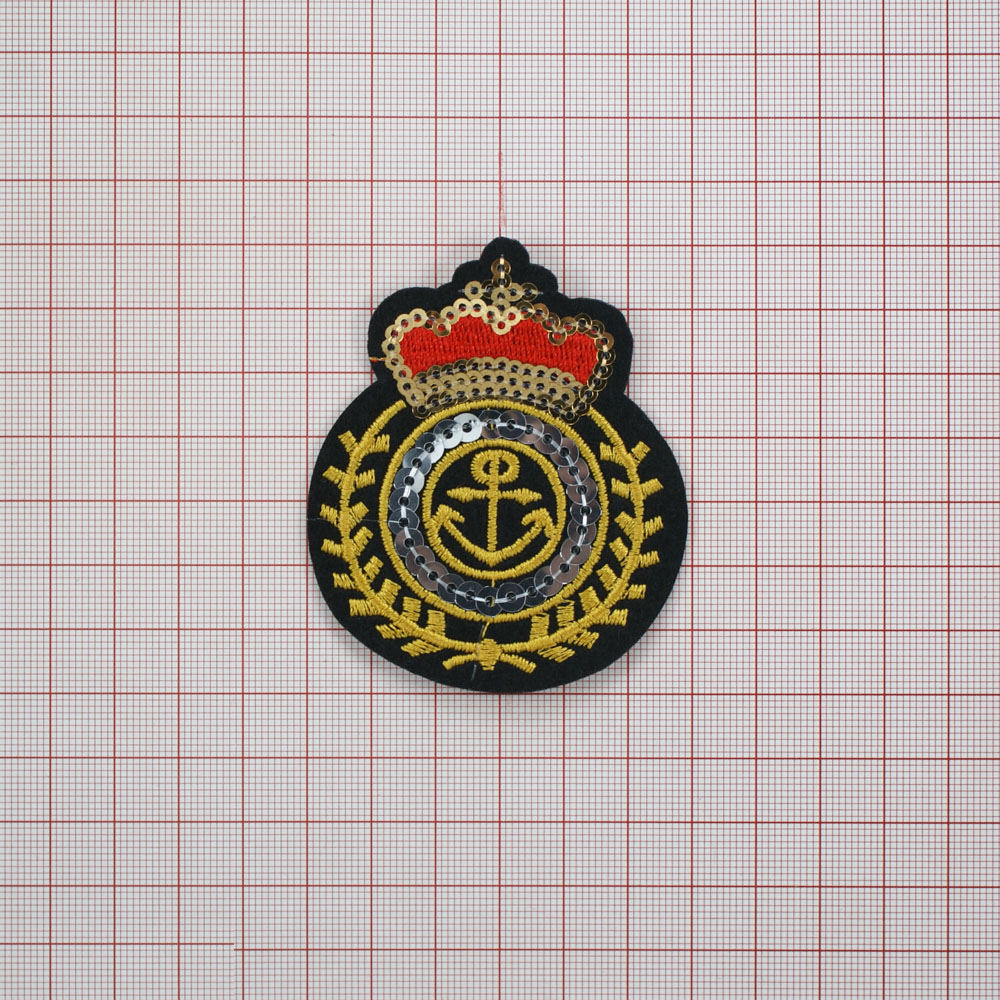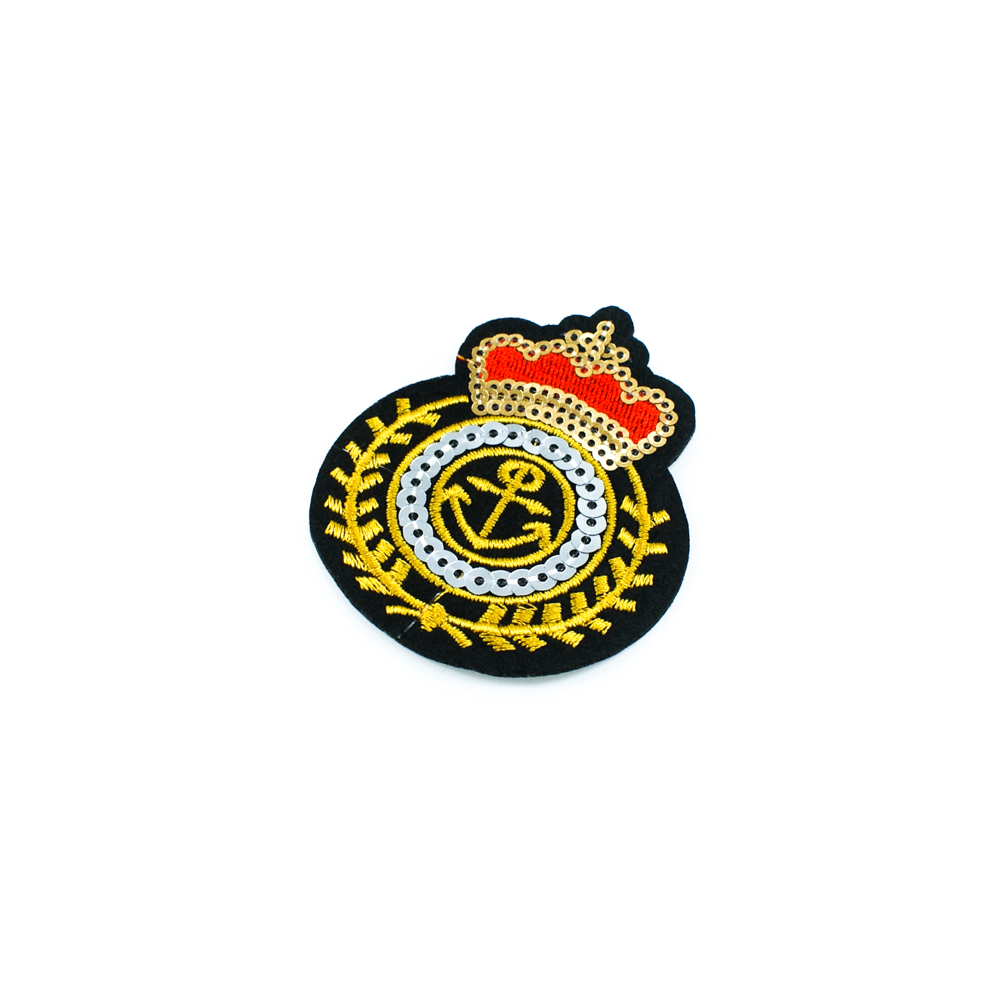 Аппликация клеевая вышитая Эмблема 7*6см желтые, красные нити, золотистые, серебристые пайетки
