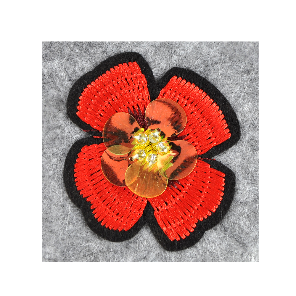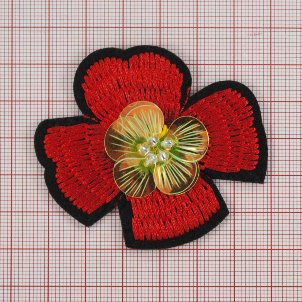 Аппликация клеевая вышитая Красный цветок с пайетками, 6,3*5,7см, красный, золотые пайетки