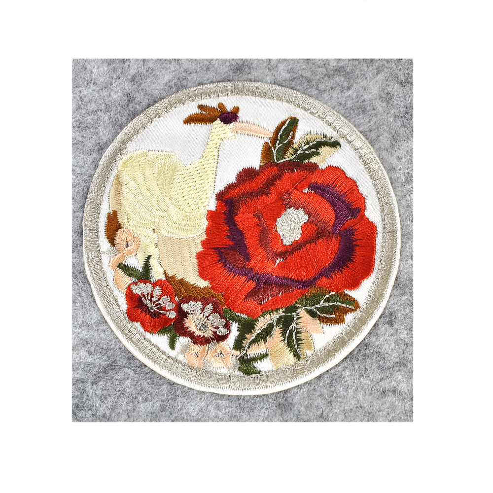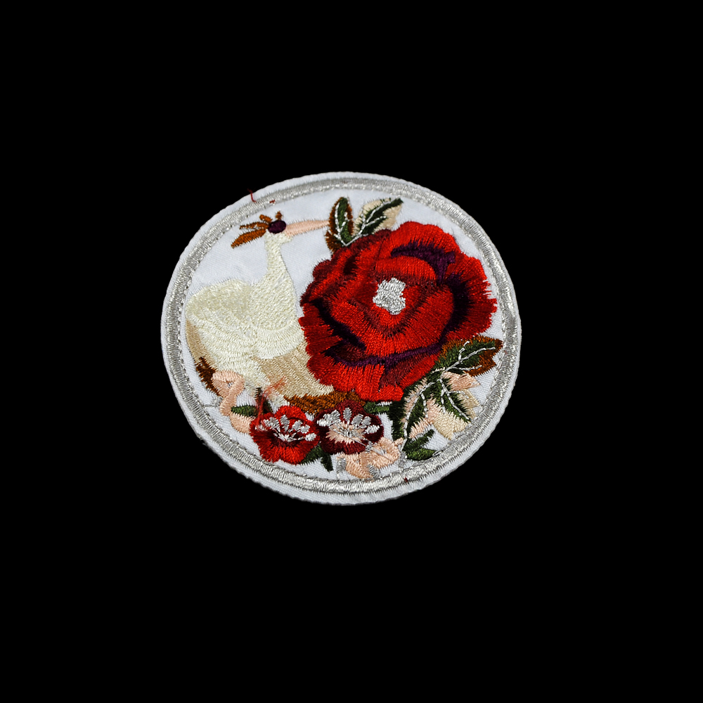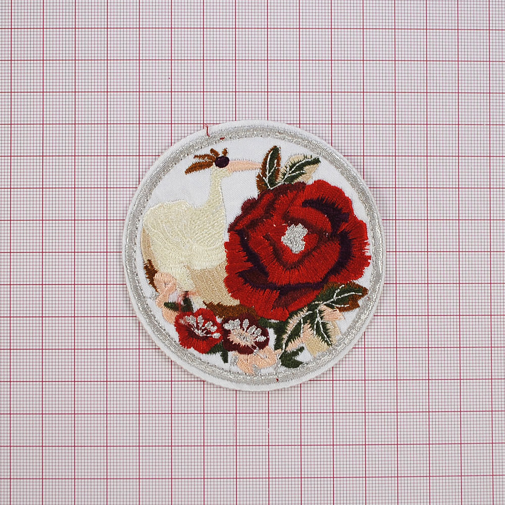 Аппликация клеевая вышитая Райская птица кремовая и роза 85*85мм, круглая, белый, кремовый, красный, зеленый