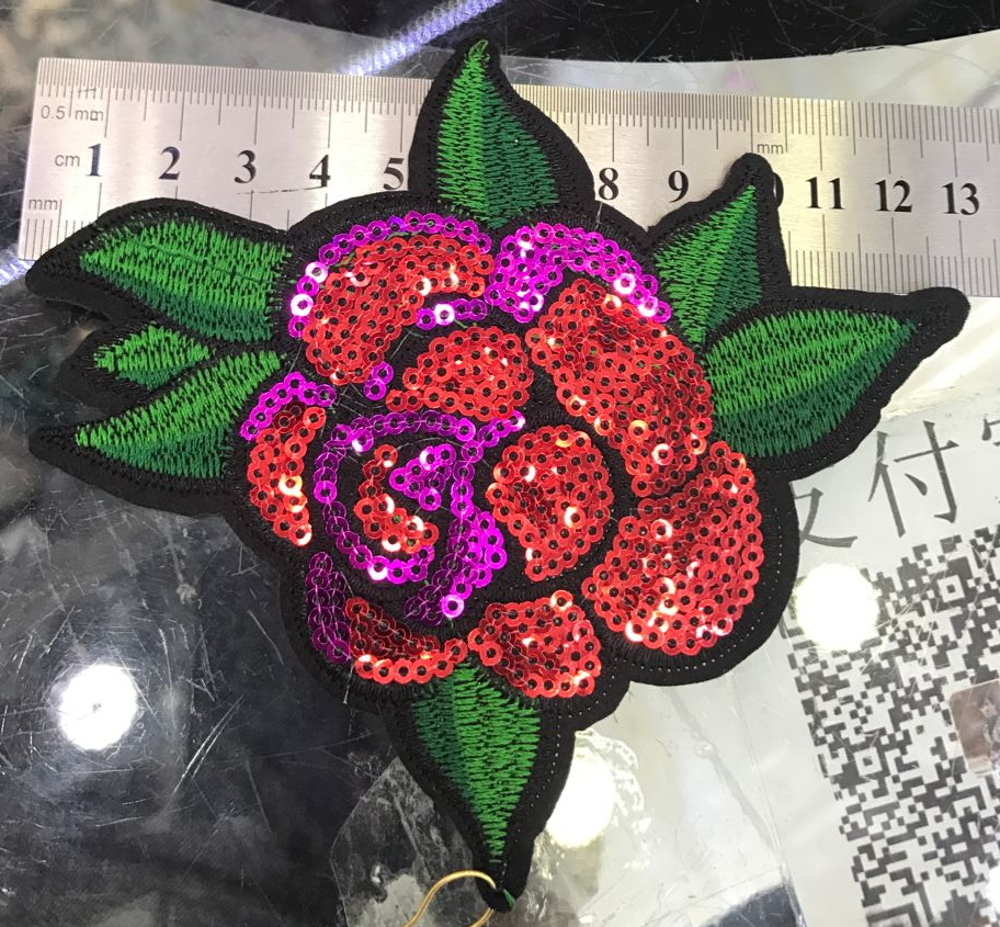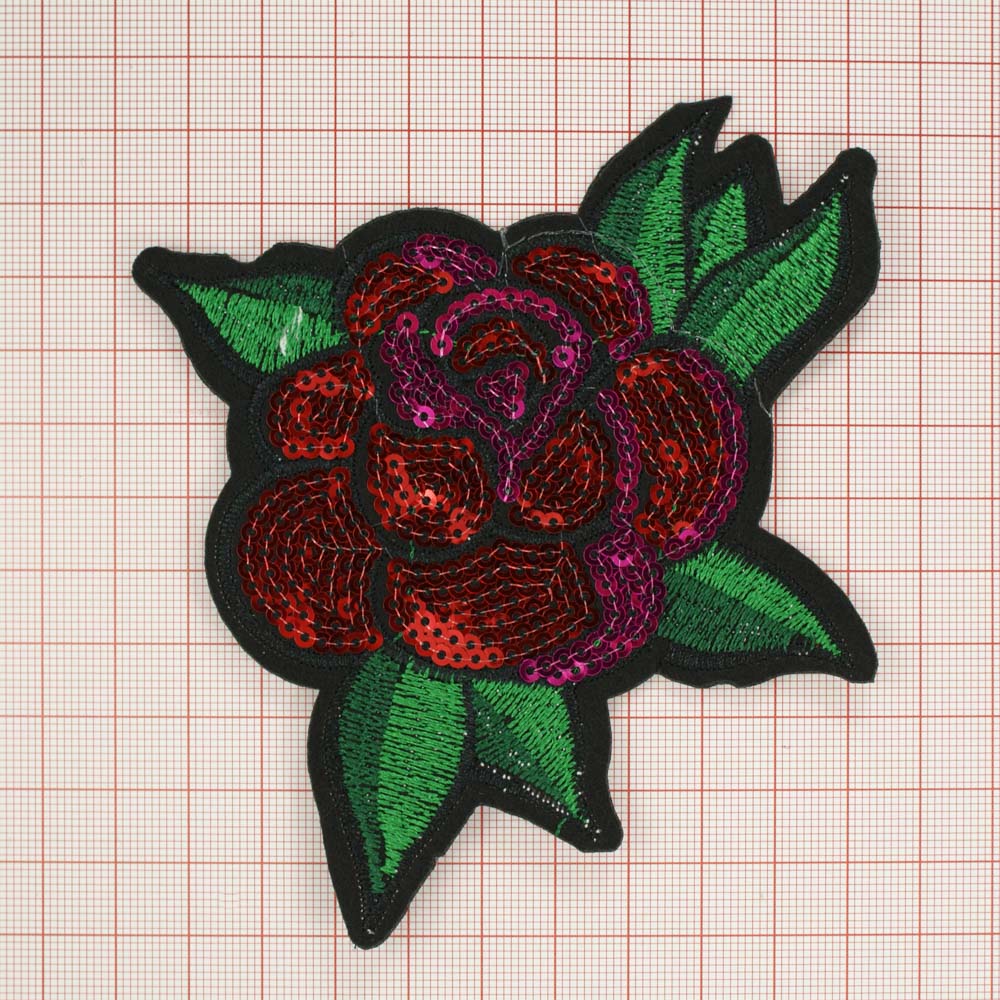 Аппликация клеевая вышитая Роза Пайетки 13*11,5см зеленые, красно-фиолетовые пайетки, шт