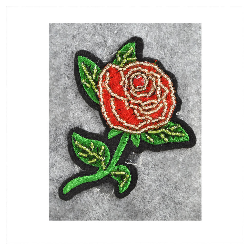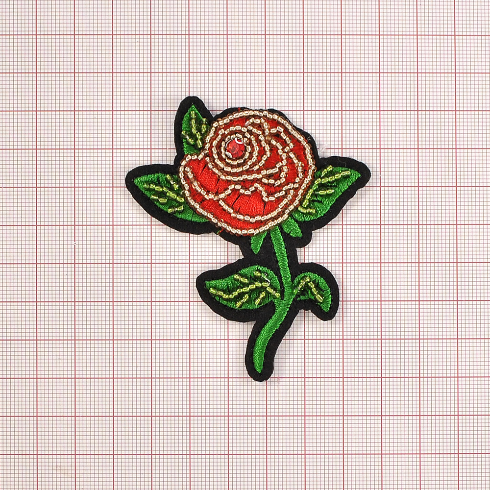 Аппликация клеевая вышитая Роза с бисером 76*60мм, красный, зеленый, цветной бисер