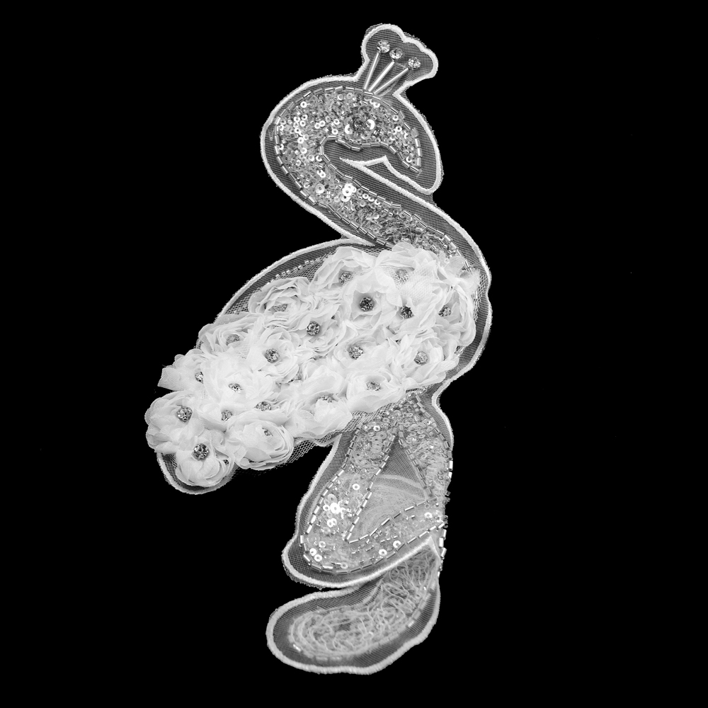 Аппликация круж. приш. Белый фламинго из роз, 35*16см, бел., сер., пайетки. стразы, бисер, шт