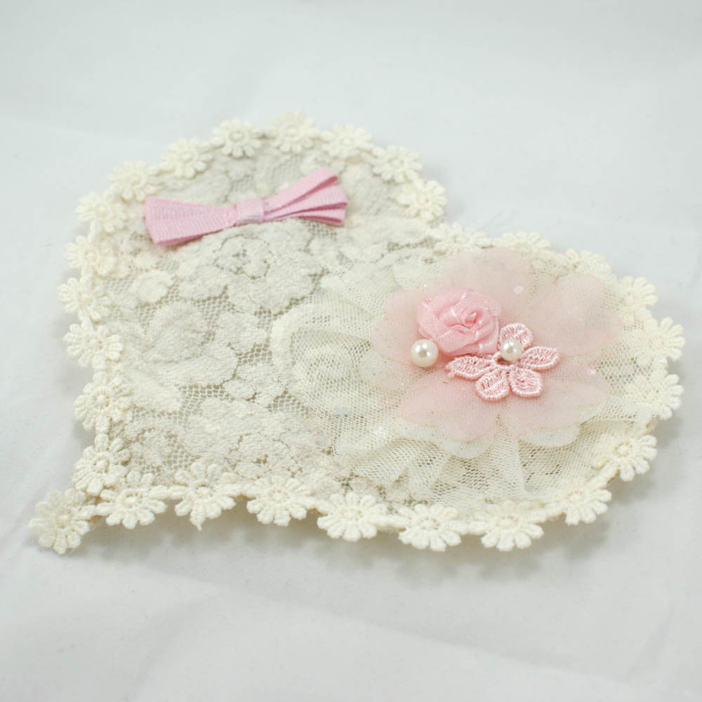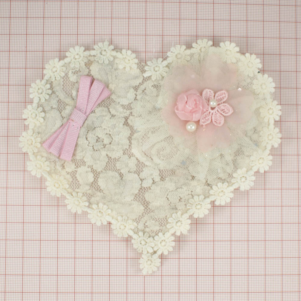 Аппликация кружевная пришивная Сердце 15*15см, кремовая, розовая, цветочки, бантик, жемчуг, кружево