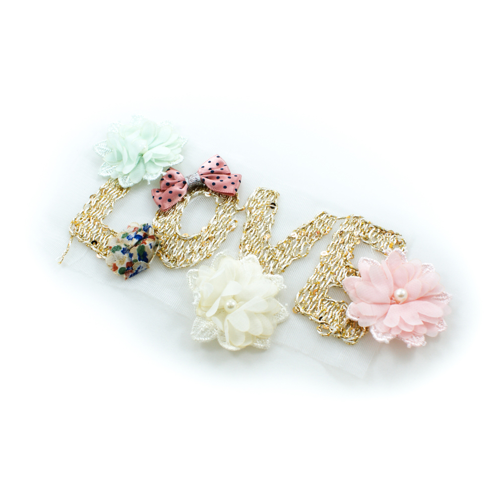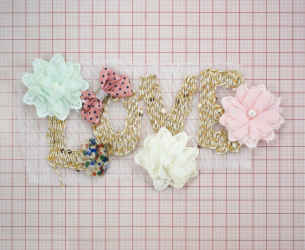 Аппликация вязаная LOVE буквы Три Астры 21*9см бело-золотая, светло-салатовый, светло-розовый, розовый бант в синий горошек, шт