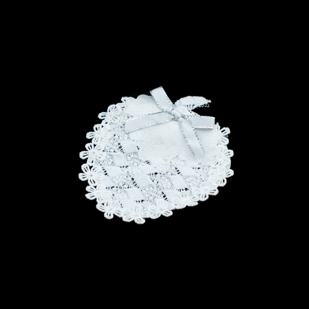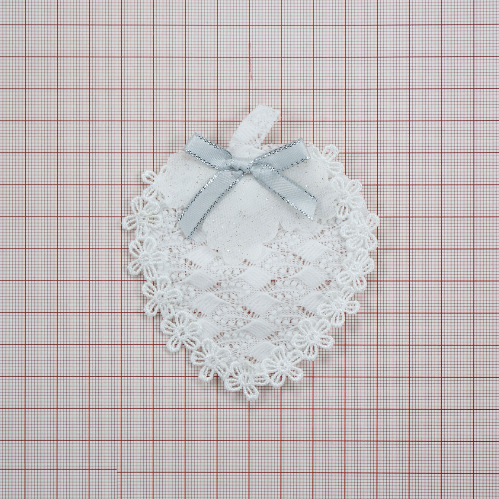 Аппликация вязаная пришивная Корзинка овал, кружево, бант 7,5*9 см белая, серый бант