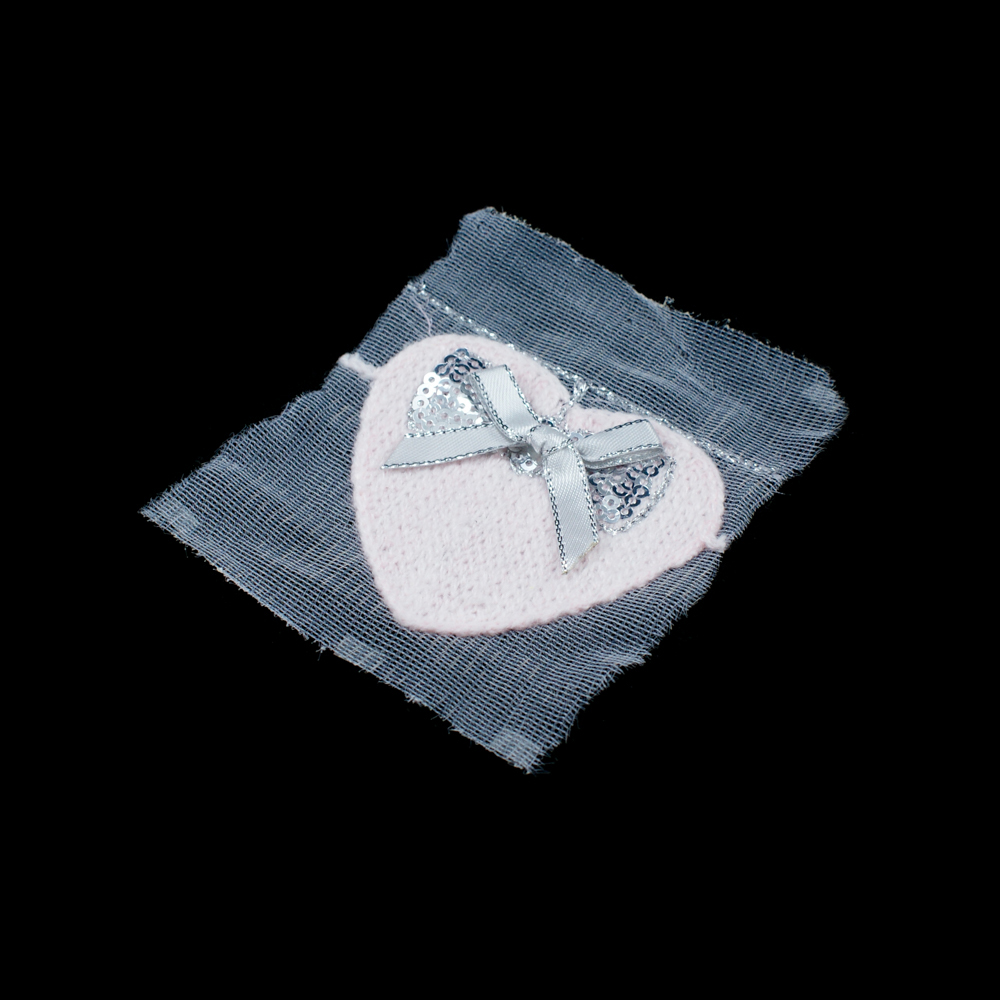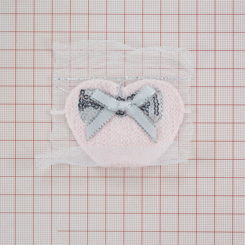 Аппликация вязаная пришивная Сердце и бант 7*6см розовый фон, серый бант