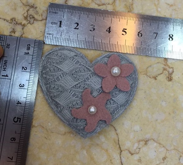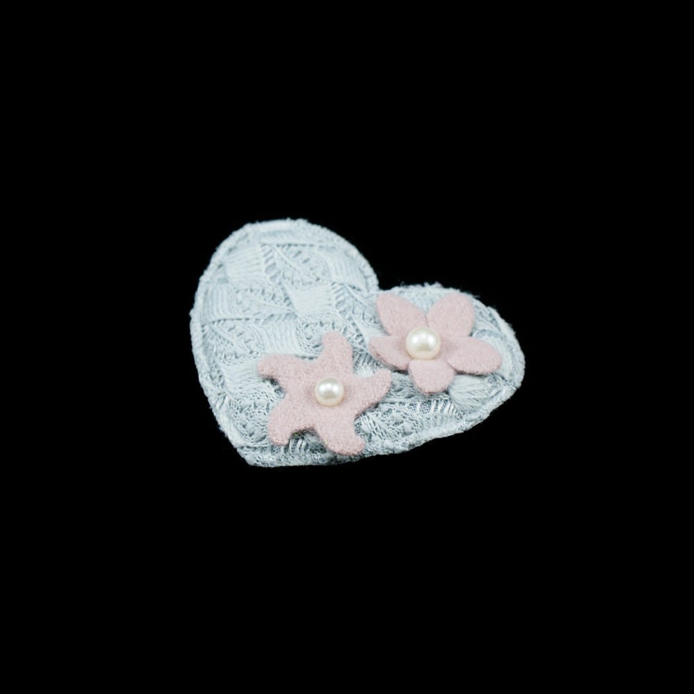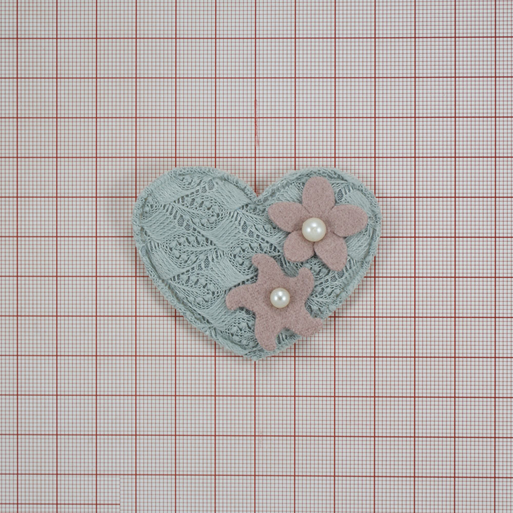 Аппликация вязаная пришивная Сердце и цветы, две жемчужины 6*6,5 см.серое сердце, розовые цветы, жемчужины