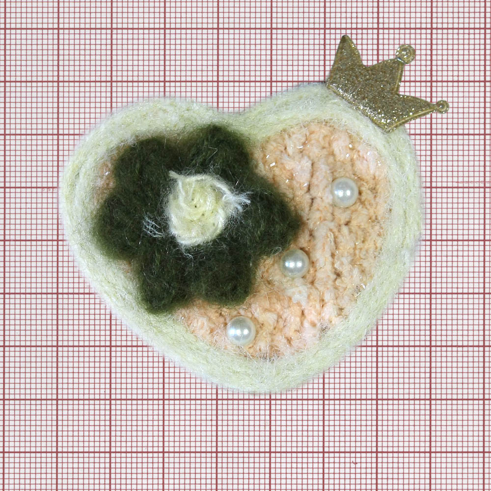 Аппликация вязаная пришивная Сердце Корона 6*7см светло-розовая, бежевая, болотная, корона золотой глиттер, белый жемчуг, шт