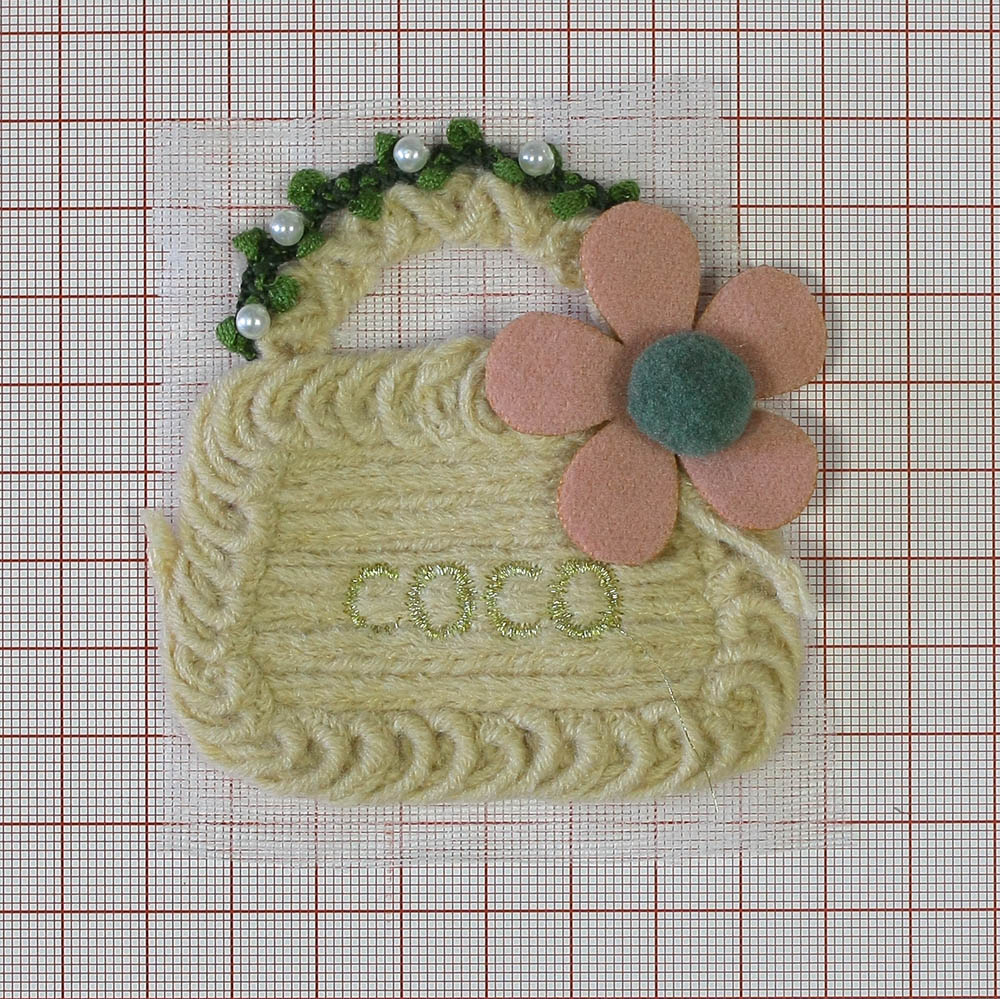 Аппликация вязаная пришивная Сумка COCO 7*7,5см Правый бежево-розовый цветок, золотой люрекс, белый жемчуг, шт