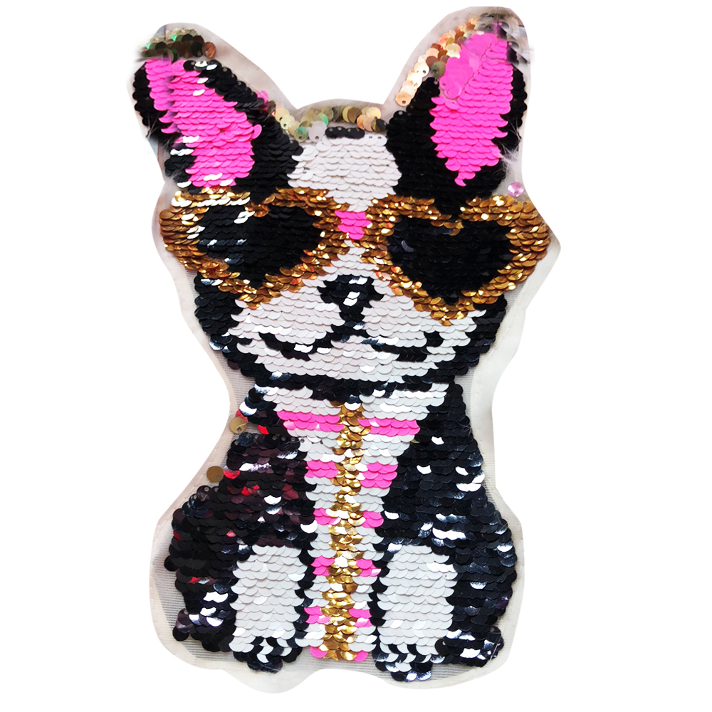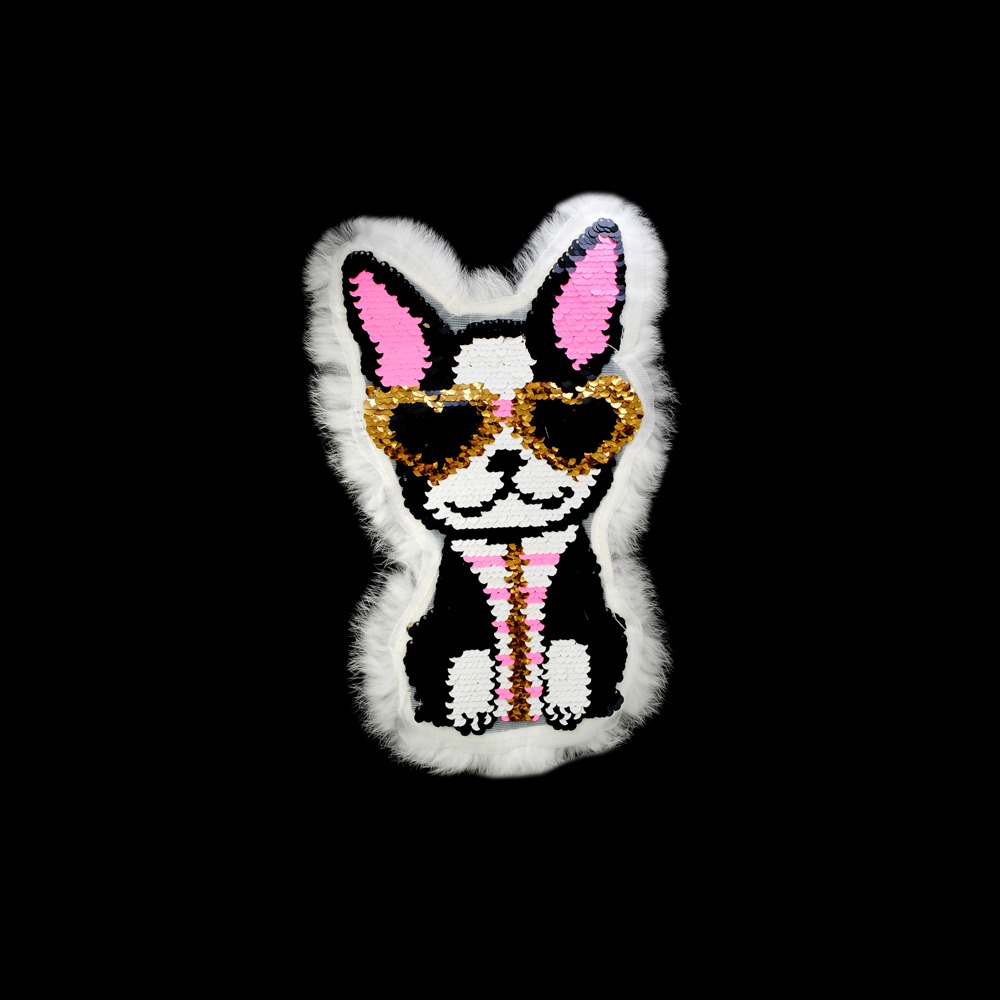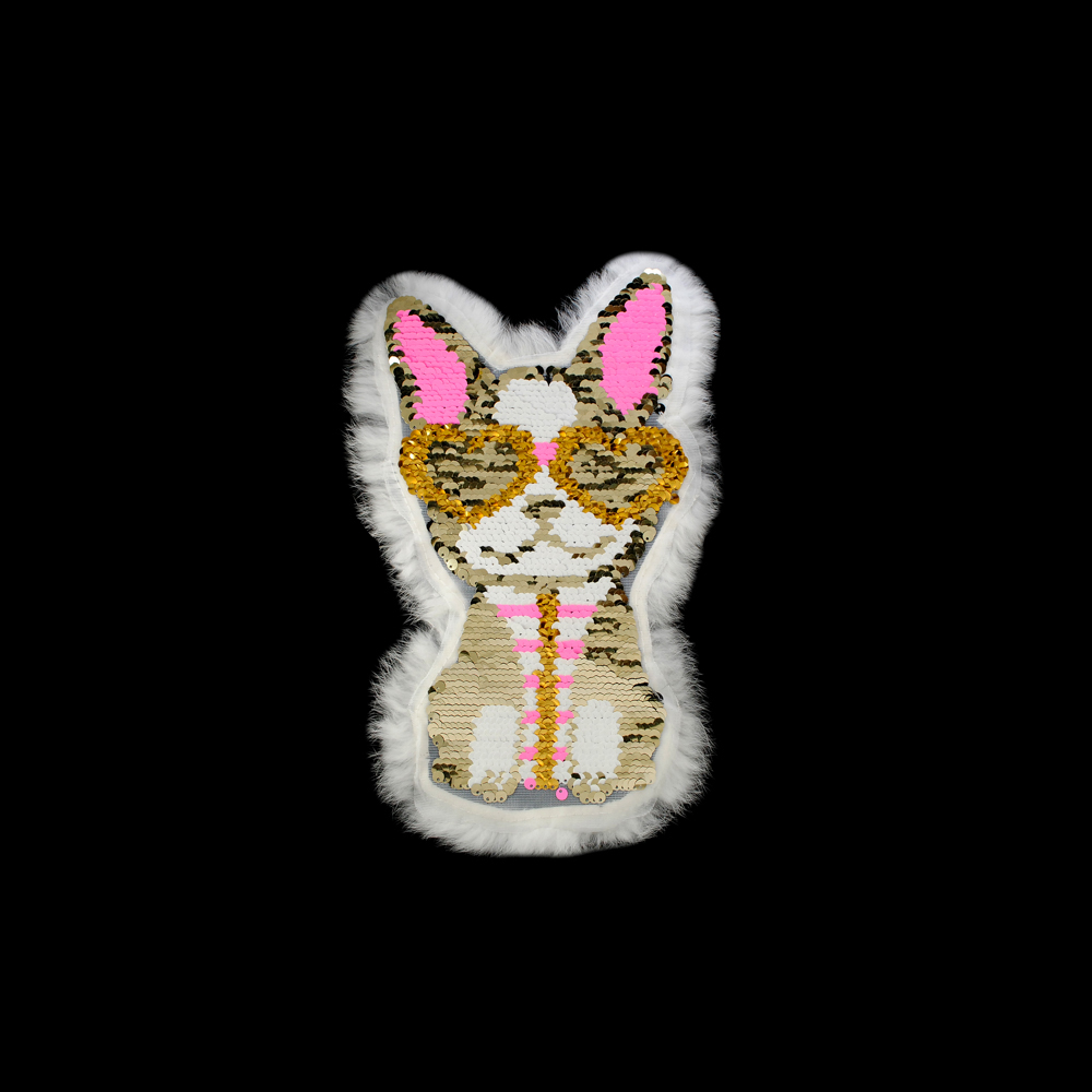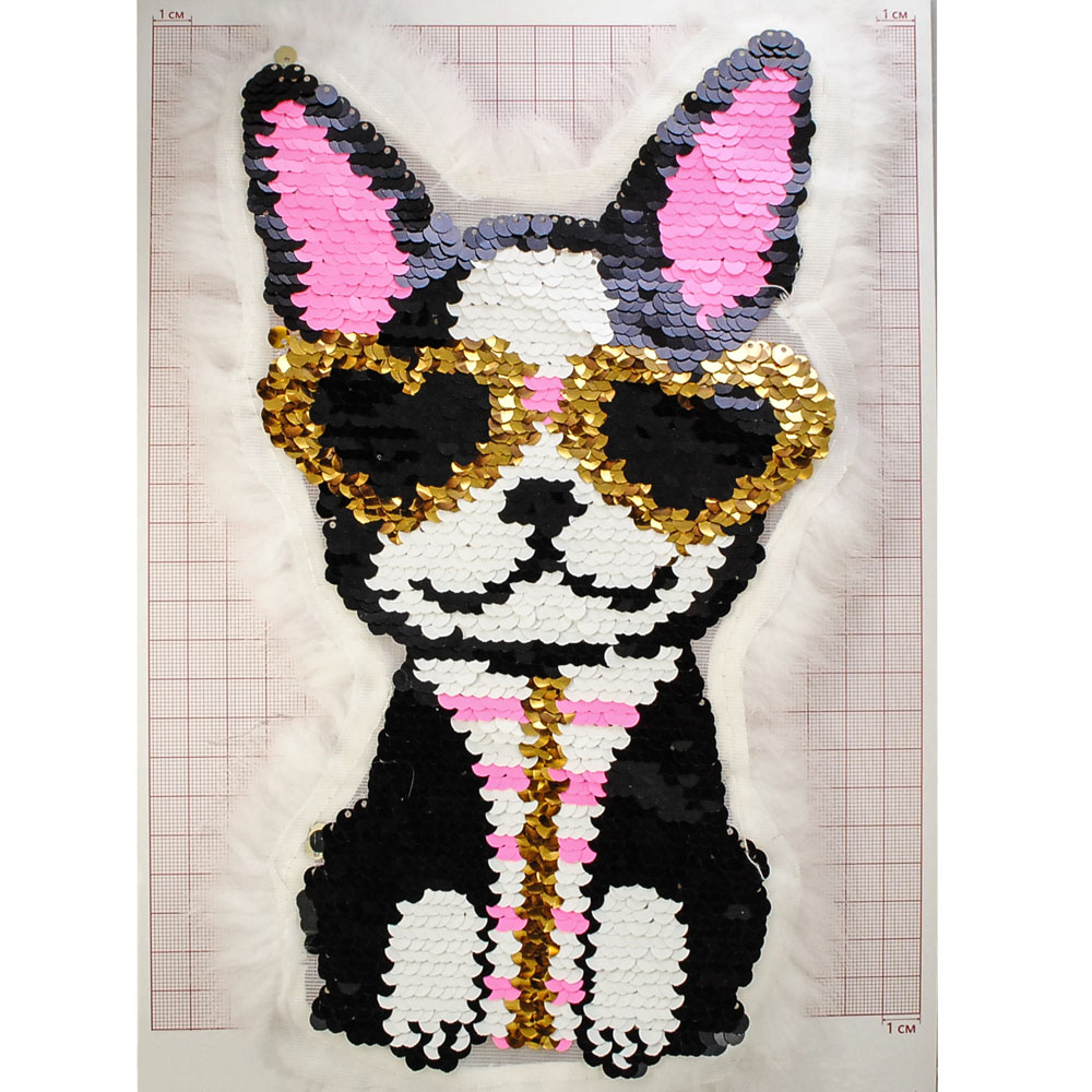 Аппликация пришивная пайетки двусторонняя и мех Собака в очках 29*16см розовый, коричневый, черный, белый, белый мех, шт