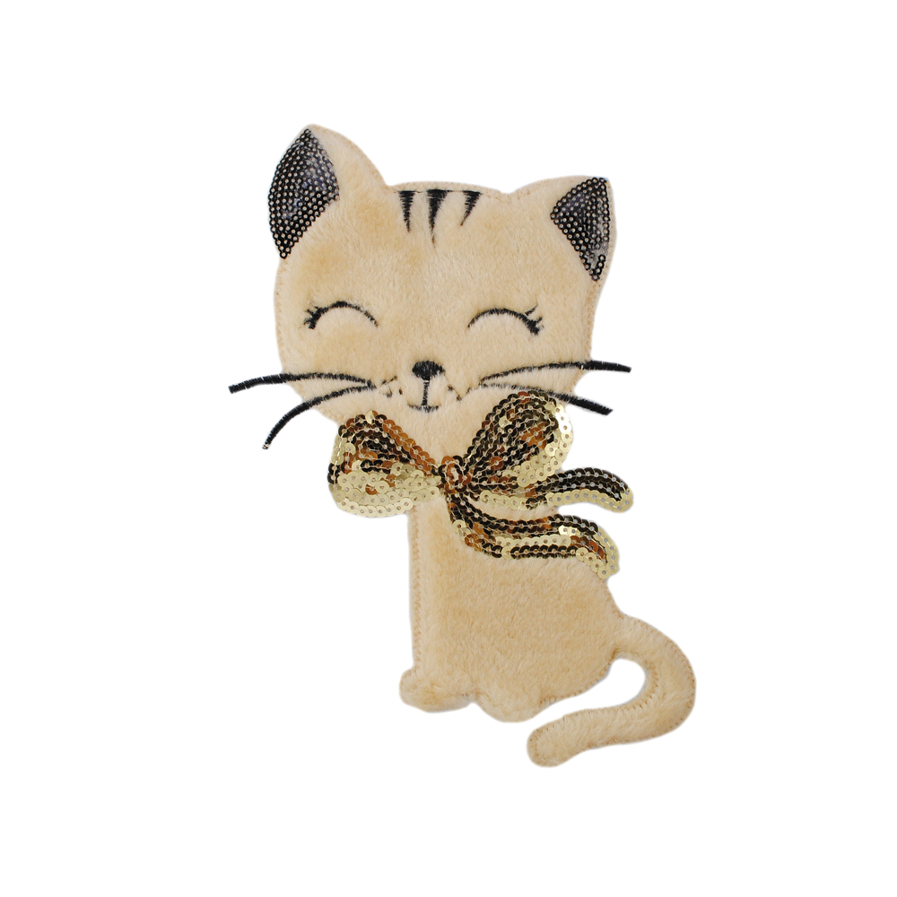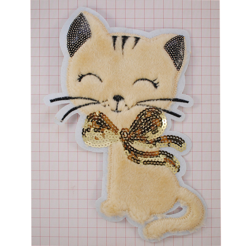 Аппликация пришивная пайетки и мех Котенок, 16,5*24,5см, бежевый, черный, золото, шт
