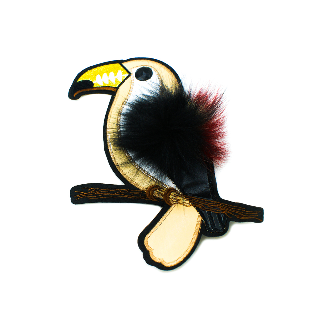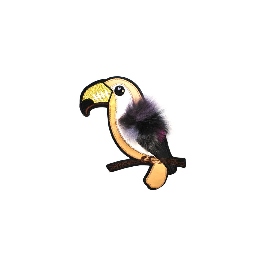 Аппликация пришивная с мехом Попугай 15*24см бежевый, черный, малиново-розовый мех, черный камень, шт