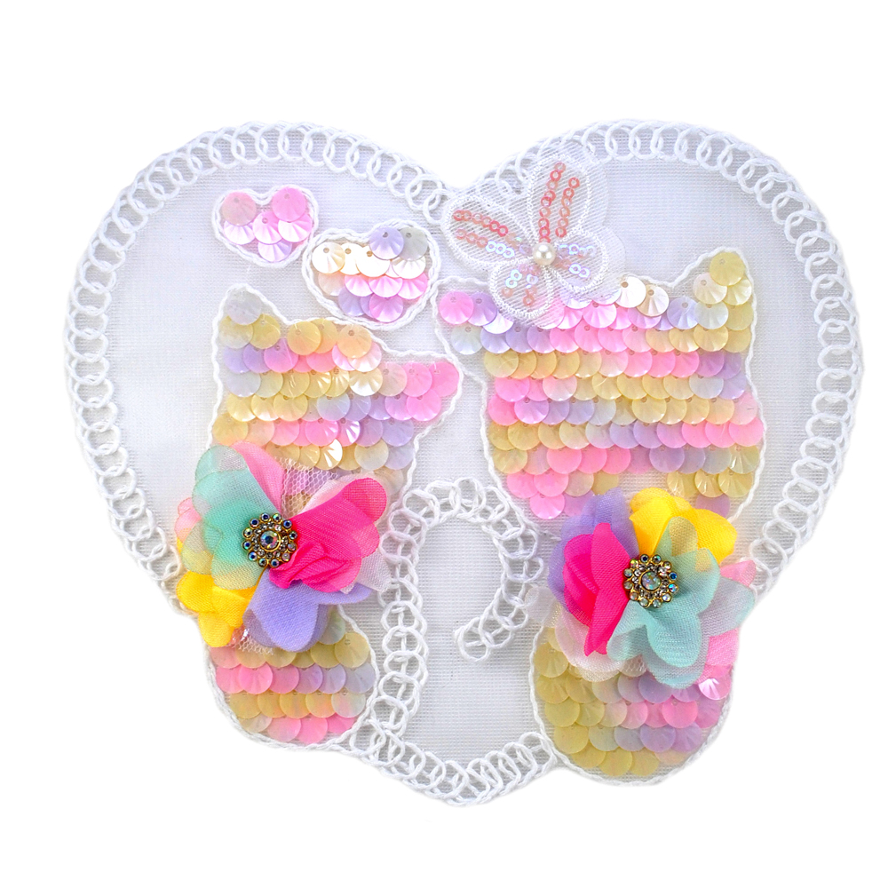 Аппликация приш. Сердечко, кошки, цветочки, 16,5*20см, белый, желтый, розовый, цветные пайетки, контур узор, стразы, жемчуг, шт