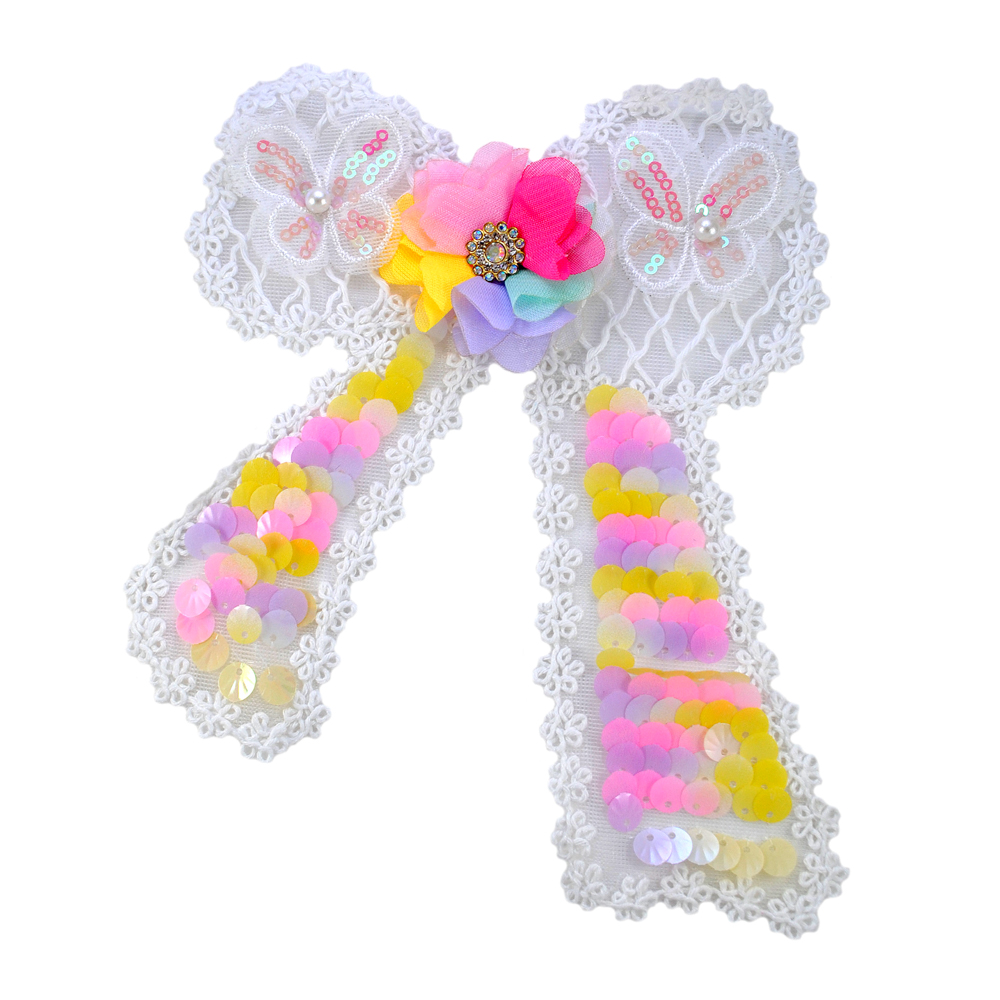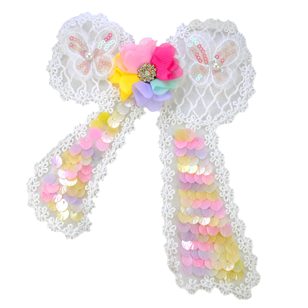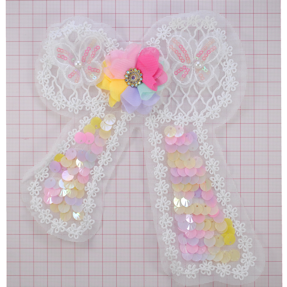 Аппликация пришивная Бантик и бабочки, 14*19см, цветные пайетки, контур узор, жемчуг, стразы, шт