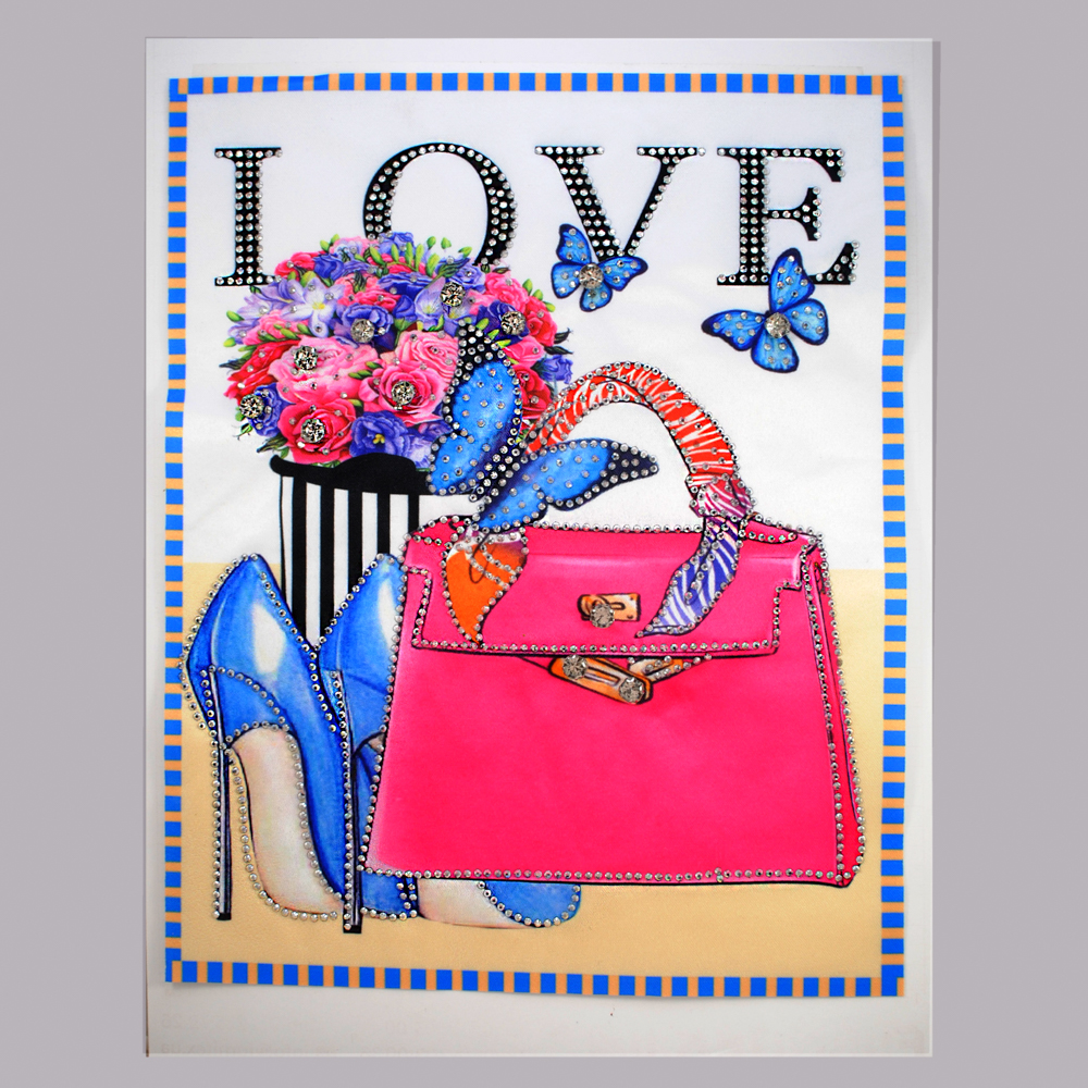 Аппликация приш. Сумка и туфли Love, 19*23,9см, роз., син., бел., стразы, шт