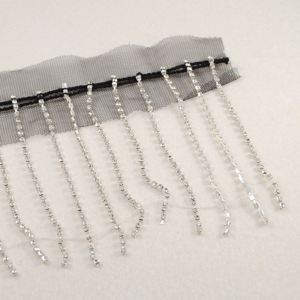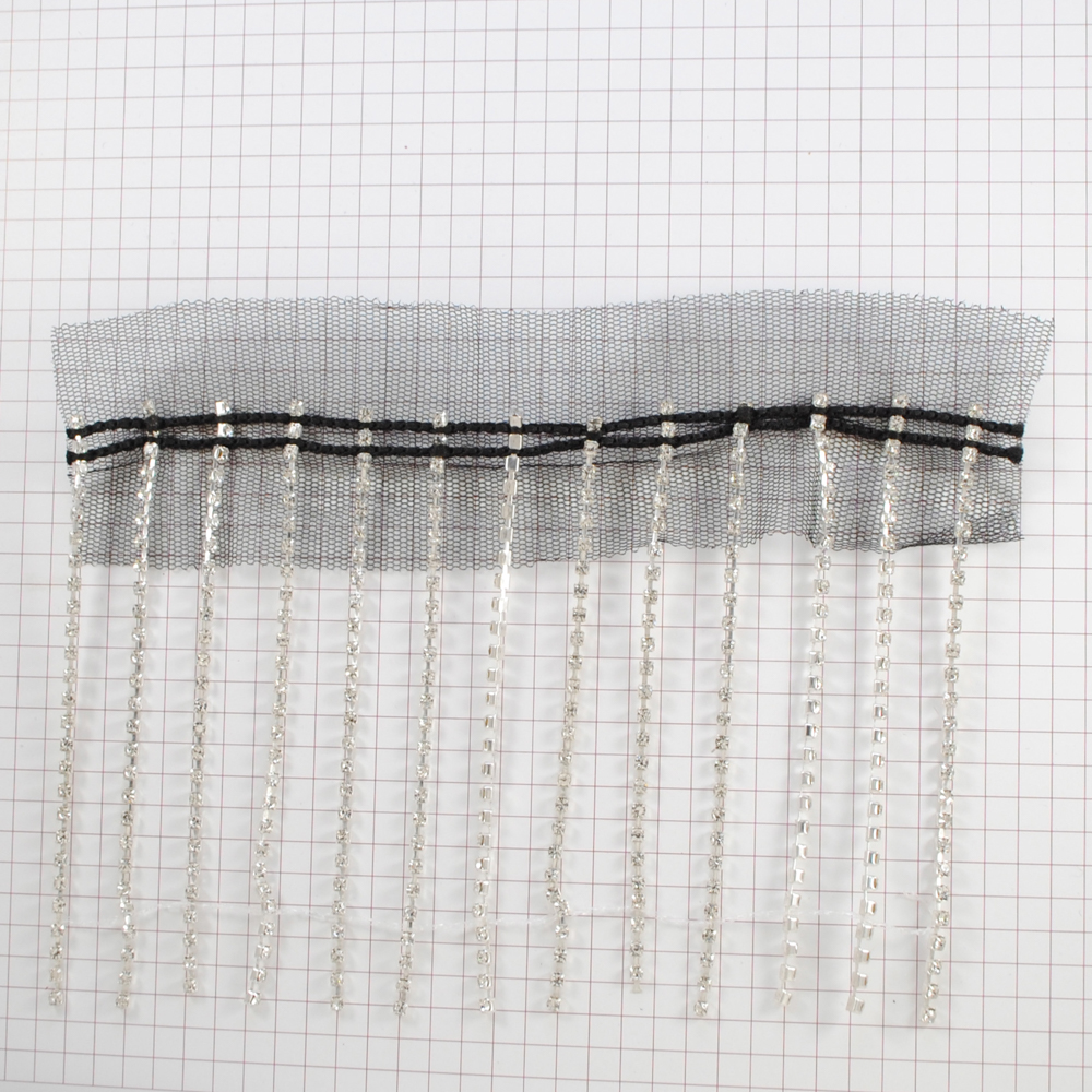 Бахрома из страз на сетке, черная основа, никель, бел.камни, 10см, ярд